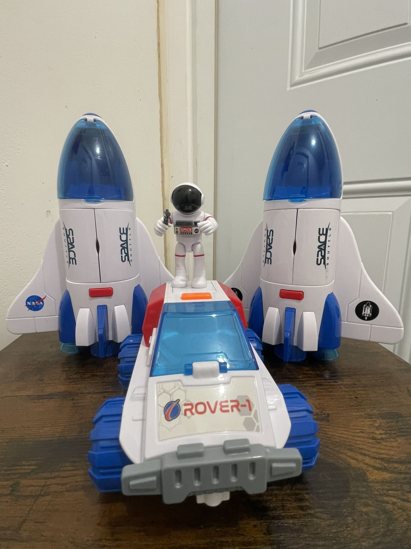 Up for sale is an Astro Venture Space Shuttle and Rover playset in good used condition. This set includes one space shuttle, one space rover, and one astronaut figure. ✨ Features: • Shuttle has working lights and blast‑off sound effects (battery‑operated and functional) • Mechanical arm on the shuttle • Opening cockpit doors • Rolling wheels on both shuttle and rover • Space rover with opening compartments • Astronaut figure included • Good condition, no cracks • Shuttle functions properly with sound and lights (needs batteries) Perfect for collectors or kids who love space play!