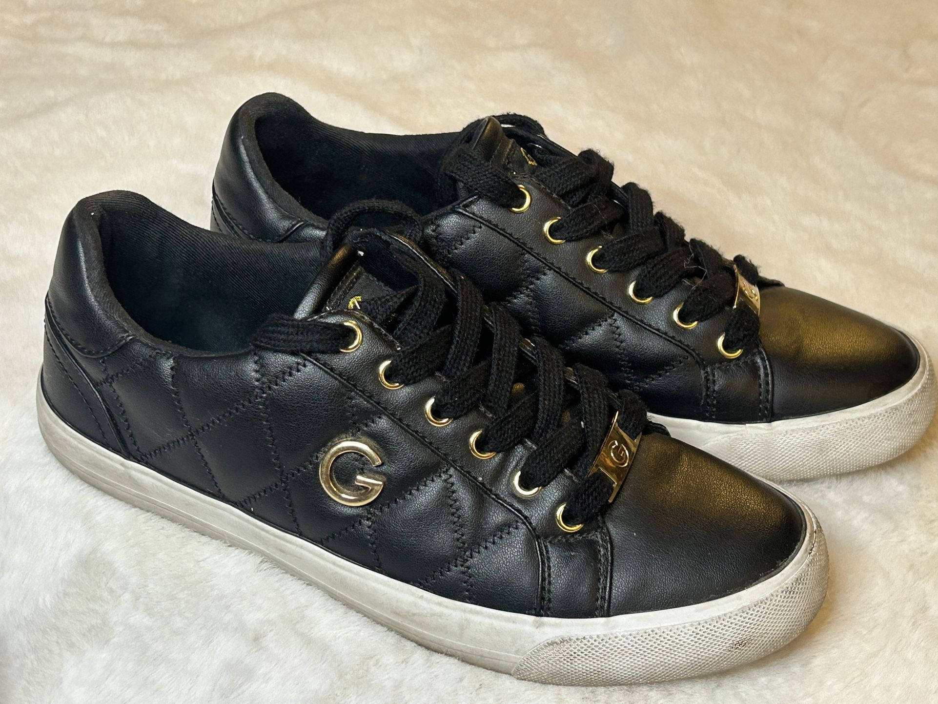 Black Guess quilted low-top sneakers with gold logo hardware and lace-up closure. Pre-owned with light sole wear, men’s size 6.5