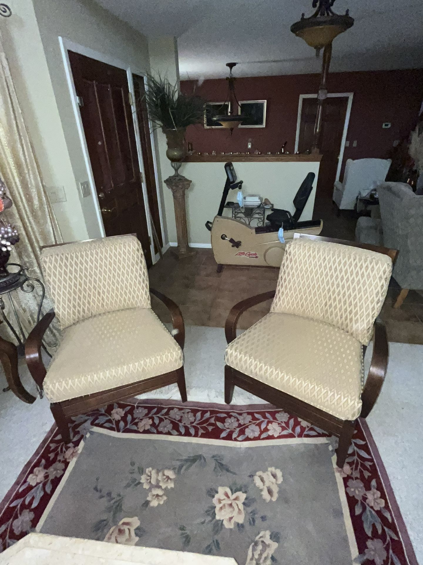 Two wooden side chairs with sandy gold cushions. Stylish and comfy. Great condition!