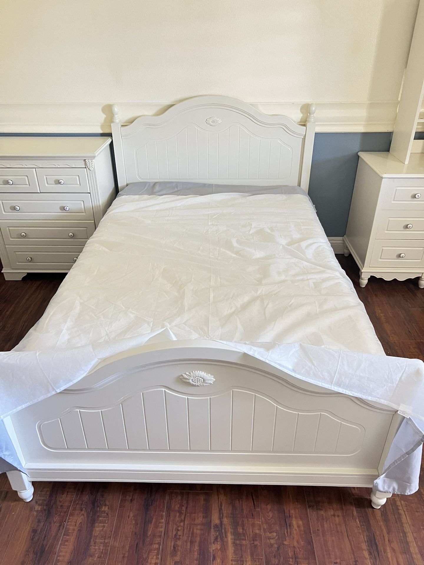 Elegant white bedroom set in excellent condition. Includes: • Bed frame (full size) • High-quality gel memory foam mattress (barely used) • Matching desk with shelves and drawers • Nightstand / dresser The mattress is in like-new condition, always used with a protector. No stains, no odor, very clean and extremely comfortable. The desk offers plenty of storage and workspace, perfect for students or a home office. This is a complete setup – ideal for a kid’s room, guest room, or anyone moving in and wanting everything ready. Well maintained, from a clean, smoke-free home. Selling as a set. Pickup only. Open to reasonable offers.