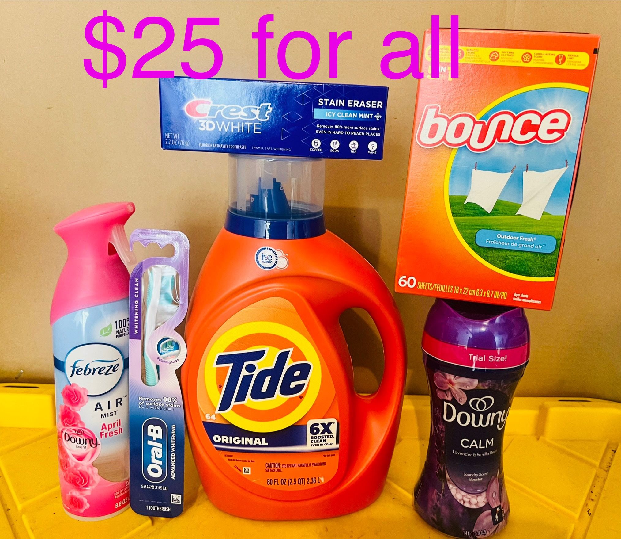 Pick up only‼️‼️ EAST SIDE SAN JOSE ‼️ 🟣1 Febreze air 8.8 oz 🟣1 downy unstoppable5 oz 🟣1 Tide 80 oz 🟣1 bounce 60 sheets 🟣1 crest 3 D white 2.7 Oz 🟣1 oral b toothbrush