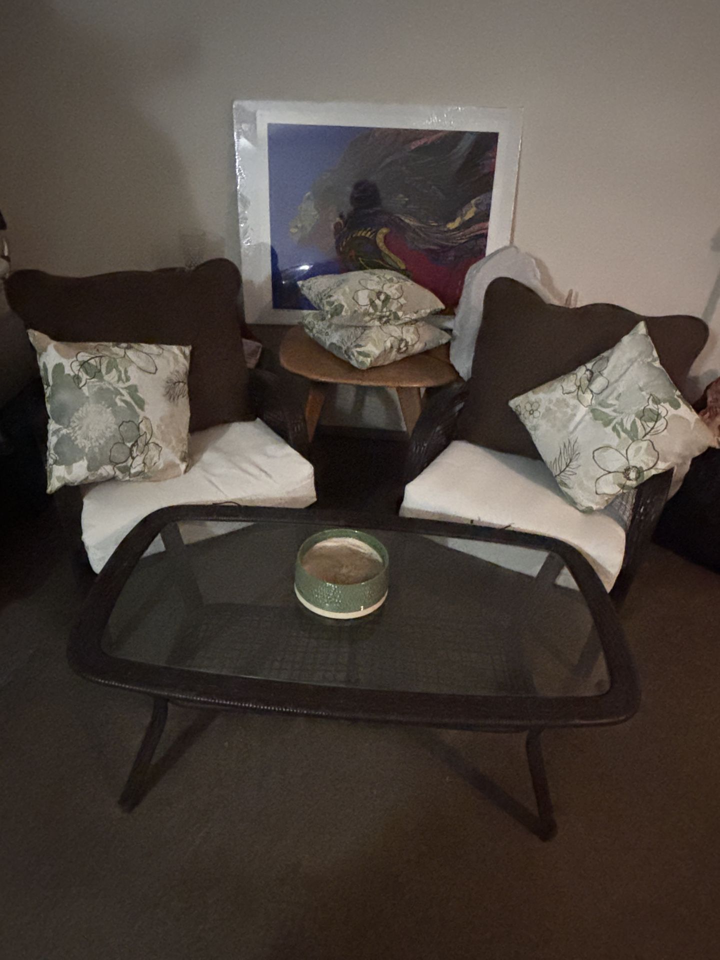 3-piece lounge style/convo piece set includes the following 2 wicker accent chairs 🪑 w/ one glass top wicker coffee table,including All great condition cushions (4)(like new!) & matching pillows!(4) 🛻✨Pick up only in Rancho Cucamonga!🛻✨Will need a truck or SUV and please check measurements(will add them once checked!)✨if you are bringing an SUV to pick up please ✨first measure yours to make sure it as I do not want to waste yours or my time! As time is money$!t5💵😉Thanks! 🙏🏻 ✨Asking✨$60/cash/firm🙏🏻💵 Firm on price! ✨Cash 💵 Only✨please, thanks 🙏🏻✨