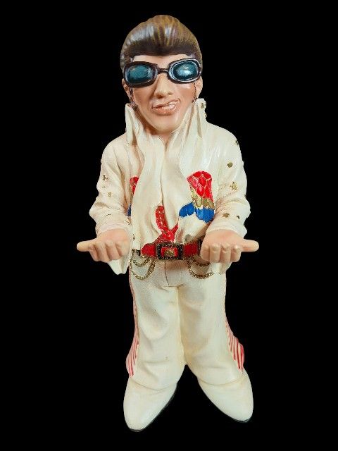 This 9" tall whimsical statue of Elvis Presley is a charming piece of music memorabilia for fans of the rock and pop genre. The statue features the iconic artist in a playful and unique design that captures the essence of Elvis Presley's unforgettable style. This original reproduction is a must-have for collectors and enthusiasts of Elvis memorabilia, adding a touch of nostalgia and glamour to any space. Kept in storage No discoloration or chips More pictures available upon request Pet free smoke free home
