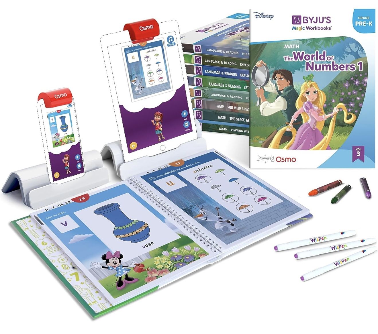 NOW ON IPHONES: Set up your Magic Workbooks on the Osmo base and reflector with either your iPad/iPhone. Children interact with physical workbooks & an iPhone or iPad. An Osmo Base is included, an iPhone and iPad are not included, both are required for game play. Check below for a full list of compatible devices. AWARD-WINNING PROGRAM: Blends interactive & hands-on learning with real-time feedback. Helps build math, language & reading skills alongside Disney & Pixar characters. 3,000+ ACTIVITIES: Designed to support children's unique learning styles, concepts are made simple and fun with educational videos, quizzes, mini-games, stories and interactive worksheets. It's a multi-sensory experience! PERSONALIZED LEARNING: Recommendations align to your child's interests, pace and learning level. Customized to help your child master the skills they need and gain confidence along the way. DISNEY & PIXAR CHARACTERS: From Frozen, Cars, Lion King, Toy Story and more your child will play and learn alongside their favorite characters. REAL-TIME FEEDBACK: With Jane as their guide, your child can play and learn independently. Jane celebrates correct answers and provides encouraging nudges to "try again", keeping your child motivated every step of the way. PRE-K GRADE LEVEL SKILLS: Matching & sorting, word sounds, tracing, color sense, shape recognition & more. Our active learning approach helps kids master foundational concepts. COMPATIBILITY: All iPads except Gen 1-4, iPad Mini 1-3 & iPad Air 1. Osmo Reflector 2021 required for: iPad Mini 6, iPad Air 4-5, iPad Pro 11” (1st-3rd Gen) & iPad Pro 12.9" (1st - 5th Gen). iPad 10th Gen, iPad Pro 11” (4th Gen) & iPad Pro 12.9” (6th Gen) are not currently compatible; compatibility later in 2023. iPHONE: iPhone 12, 12 Pro, 12 Pro Max, 13, 13 Pro, 13 Pro Max, 14, 14 Plus. Requires the Osmo iPad base & 2021 reflector hardware. Minimum iOS 13. Internet required. Due to app restrictions, the BYJU'S app will only work in the USA & Canada. WHAT'S IN THE BOX: 9 Pre-K Magic Workbooks (Math, Language, & Reading), Osmo iPad Base + Reflector, 3 Wizpens, 12 Crayons, & Quickstart Guide. Plus, includes 2 years of unlimited access to digital content in the BYJU’S Learning App featuring Disney. TABLET NOT INCLUDED. Need help? Reach out to BYJU'S Learning for support or return issues on our BYJU'S Learning website contact us page. Internet required to play. ABOUT BYJU'S: A trusted education brand that's helped 150+ million students learn across the globe. Created by educators and Disney storytellers, BYJU'S blends digital and physical learning that's loved by children everywhere.