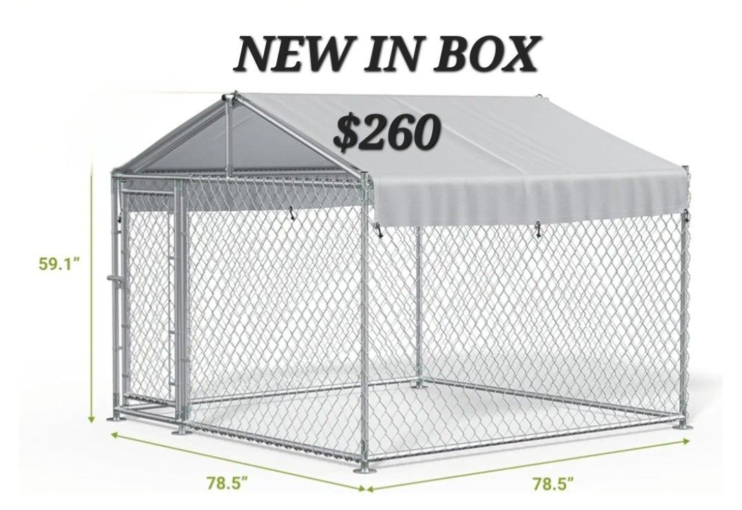 Brand New in box. Large 6.6 ' x 6.6' heavy duty Dog kennel with All weather protection tarp. Includes upgraded door lock, Oxford cloth, UV sun shade water resistant tarp. Galvanized Steel powder coated frame. Large dog Kennel indoor outdoor dog or animal cage. Easy assembly. 6.6 length x 6.6width x 6 ft high. Great for all sized dogs chickens rabbits, pigs, garden and more.