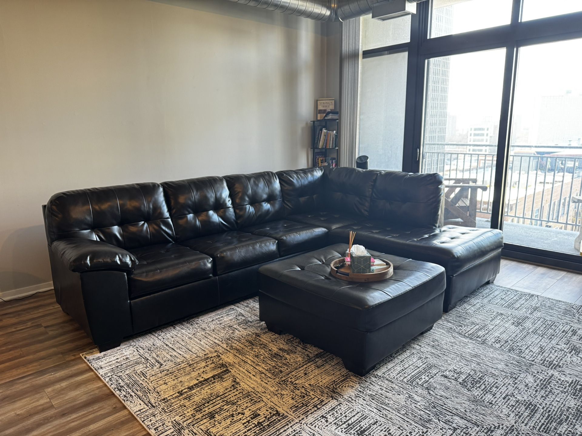 Dark brown L-shaped sectional sofa with matching ottoman. well maintained in a pet-free home. Comfortable, sturdy, and offers plenty of seating. Minor stitching wear in a small area. I don’t have exact measurements, but it is a standard full-size sectional. Ottoman can be used for seating or as a footrest. Pickup only. Open to reasonable offers.