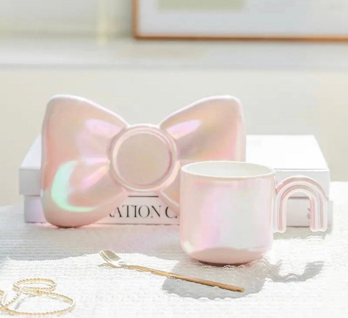 Stylish ceramic bow tea/coffee cup, spoon and saucer. Dress your home in a very unique way!