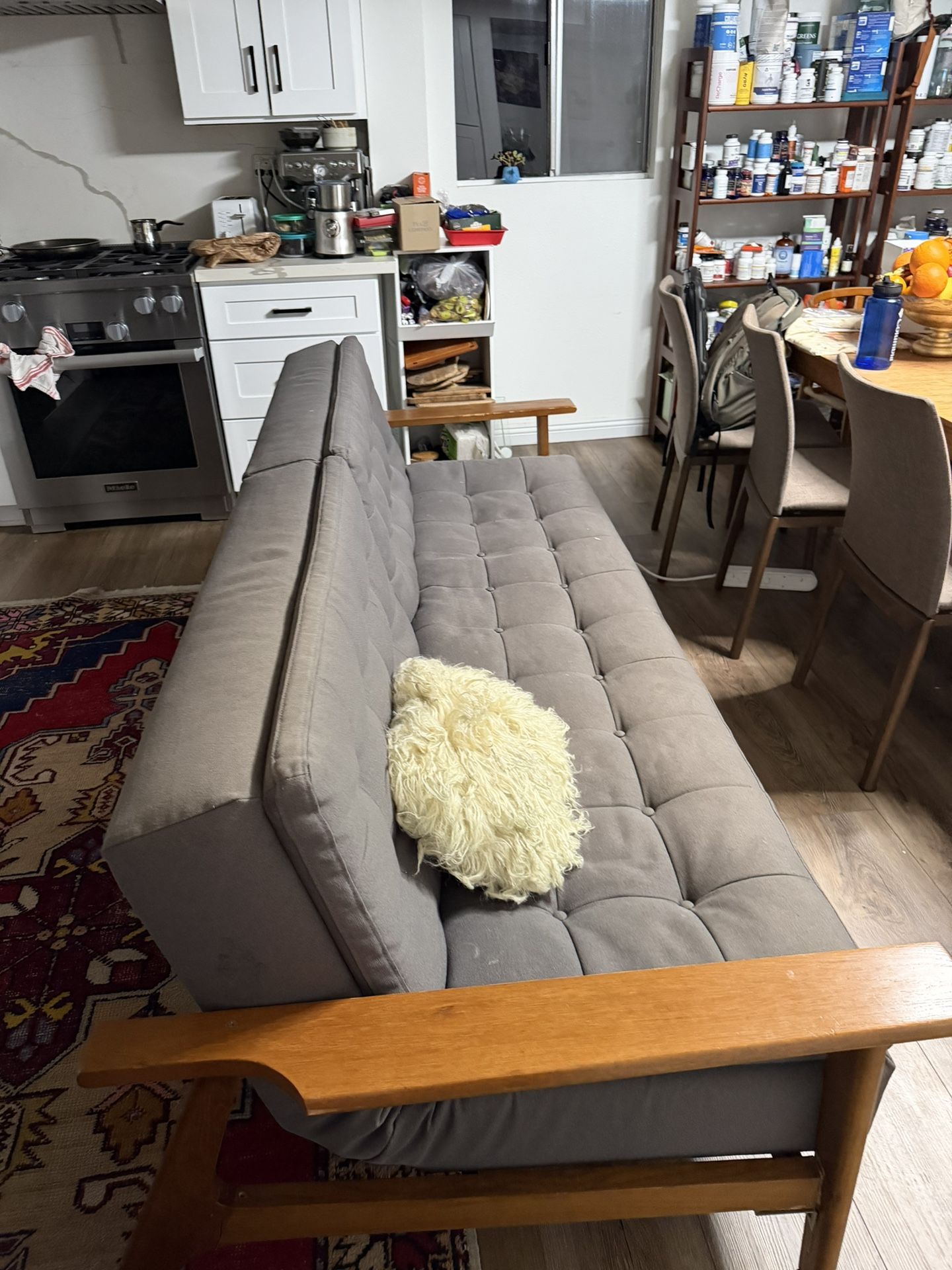 Adjust a different levels can lay down completely flat to sleep on comfortably fits two adults for sleeping. It can sit up straight to preserve space very durable metal frame has repair on one side with bolts to keep it sturdy photos attached. The material is very easy to clean. The color is perfect for busy household.