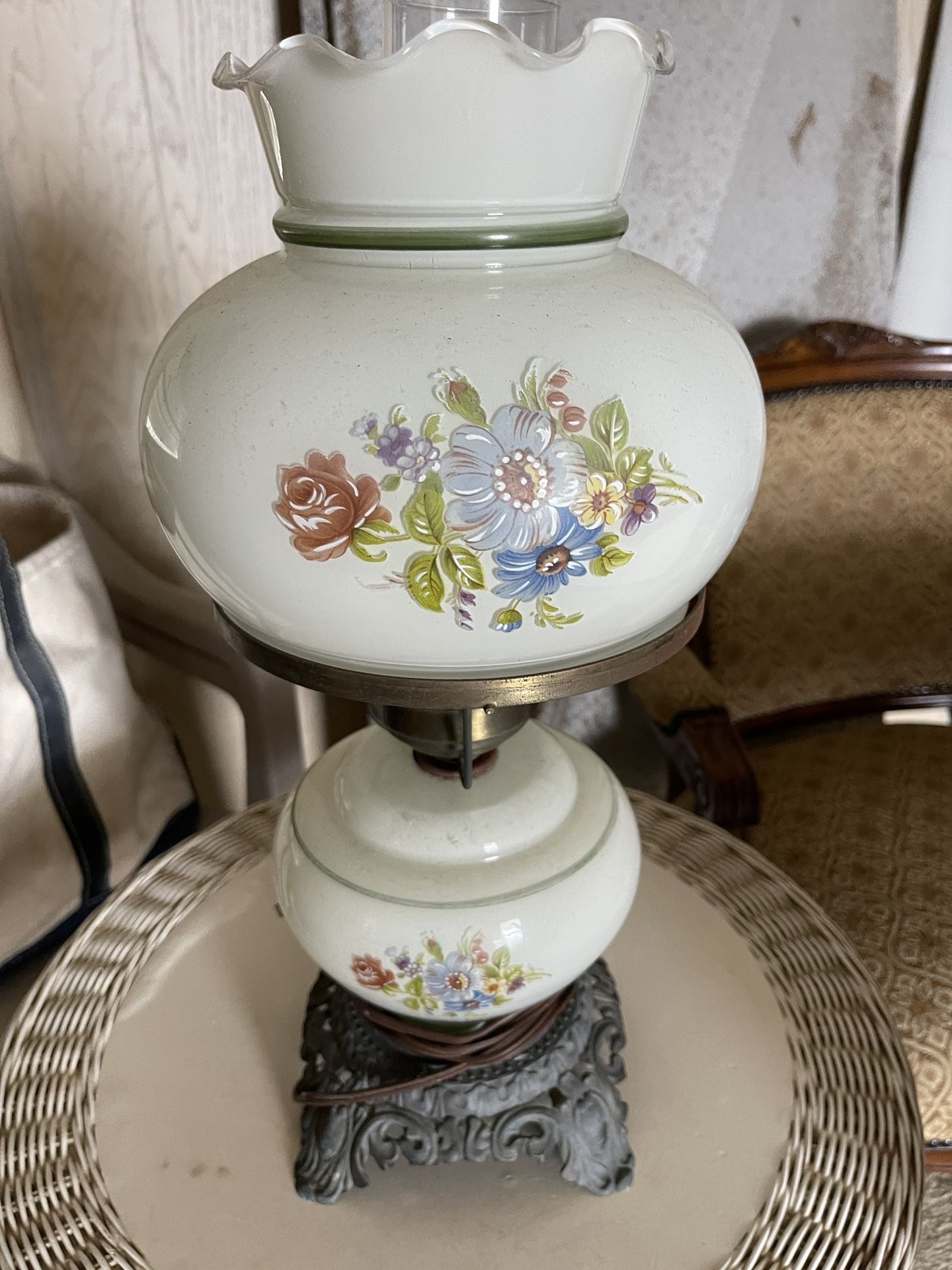 Vintage Oil Lamp Table Lamp Electric Milk Glass Shade Hand Painted Floral Cottagecore GWTW