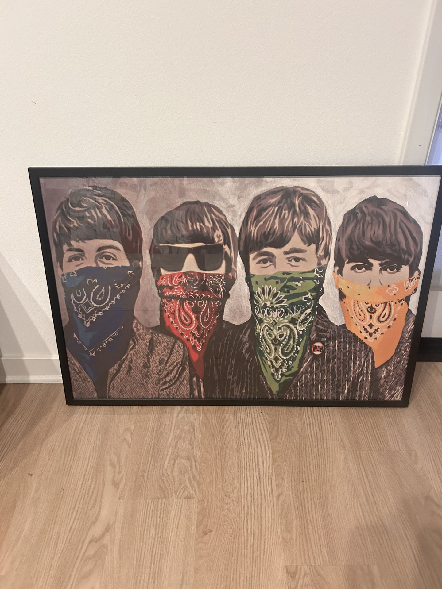 Bold pop-art wall print featuring four iconic, retro-inspired musicians wearing colorful bandana masks. Framed in black with strong graphic detail and vibrant accents. Statement piece—perfect for a living room, office, music room, or creative space. Excellent condition and ready to hang. 37 x 25 in