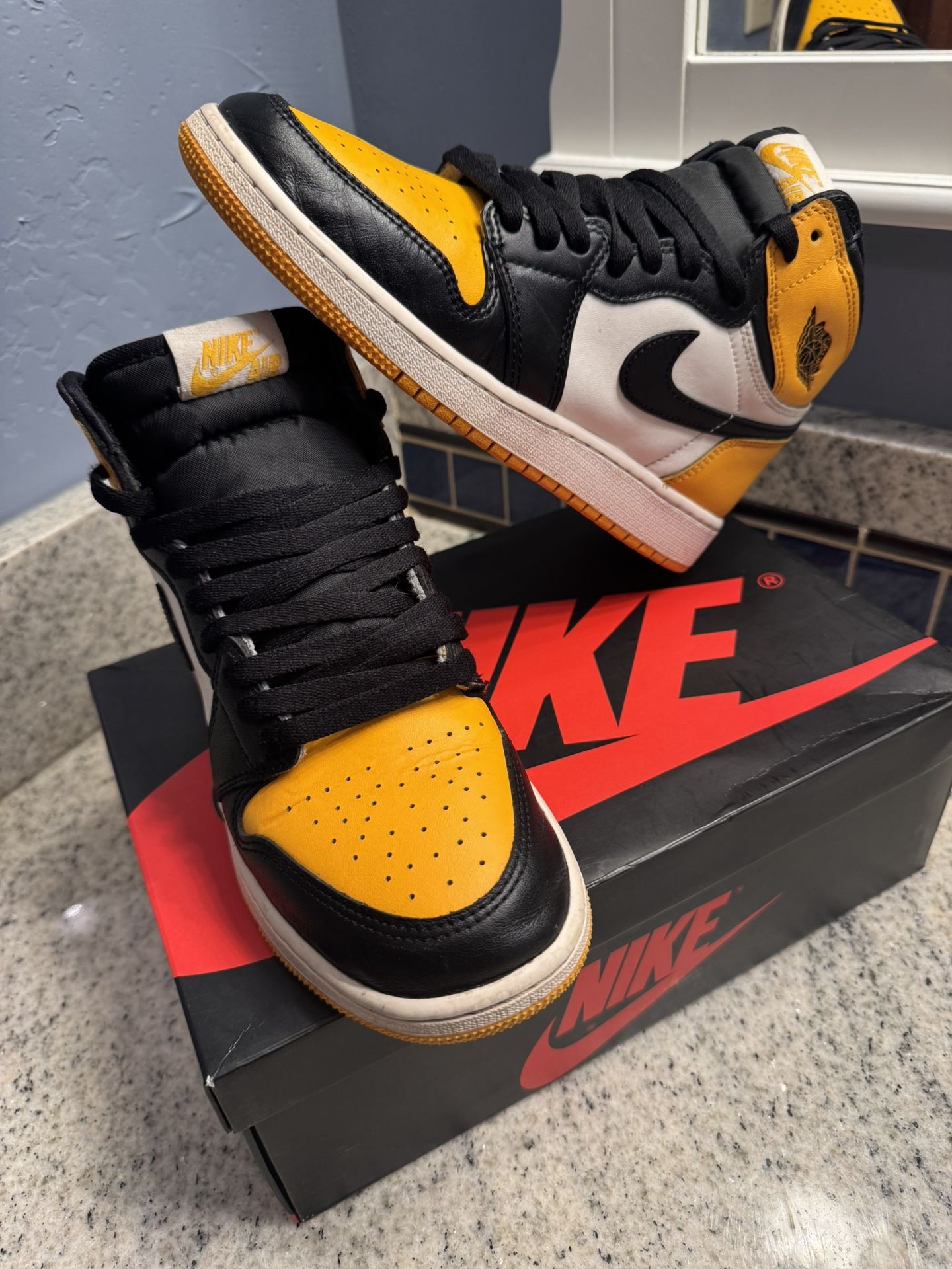 Authentic Air Jordan 1 Taxi, size 7, clean condition with minimal wear. Leather is in good shape, colorway is crisp, and soles are solid. Comes with original box. Stored properly in a smoke-free home.