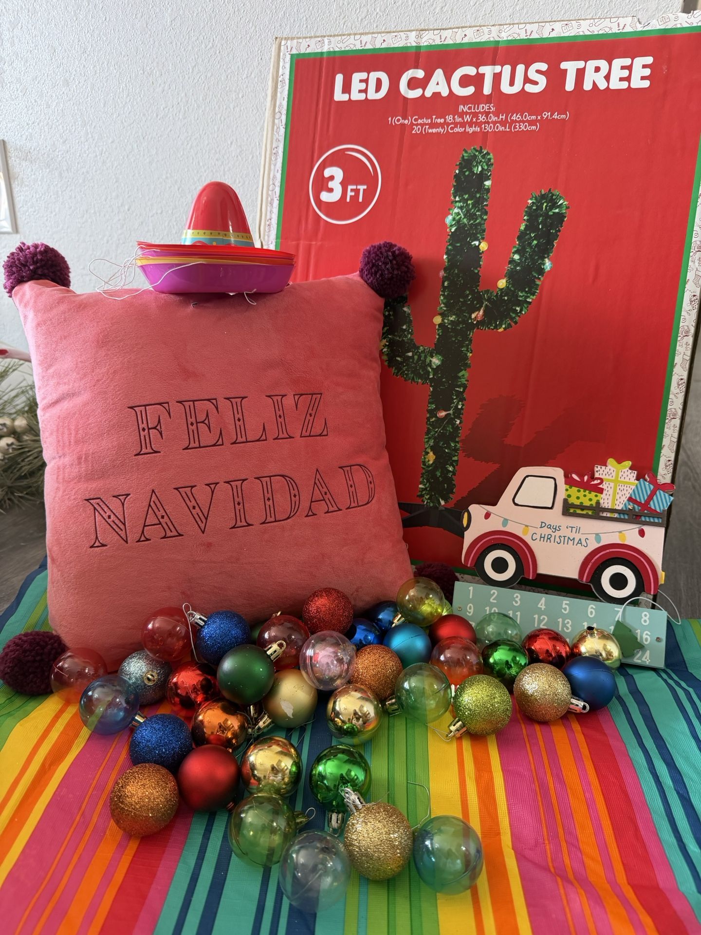 Sold as a set ONLY. Lightly used decor. Pick up by Millenia Mall Set includes: 3ft battery operated cactus tree 100 mini multi colored ornaments 1 large multicolor reusable plastic tablecloth 1 feliz navidad pillow 3pc table decorating kit 5 mini plastic sombreros 1 multicolor Christmas countdown decor