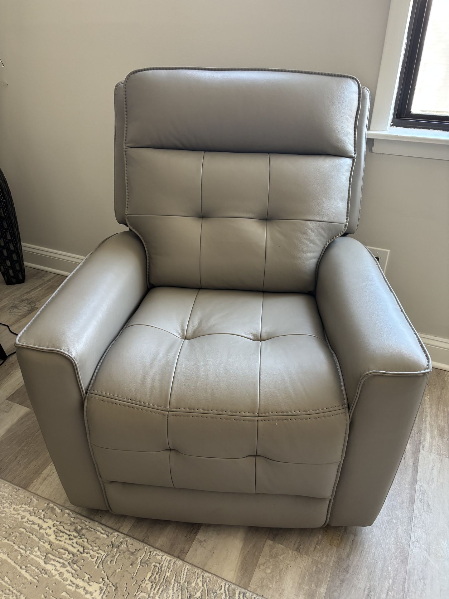 Leather recliner, sofa, and chair. Excellent condition less than eight months old. Looks brand new. Gray with dual recliners in on sofa and recliner chair. Can be bought separate or combined.