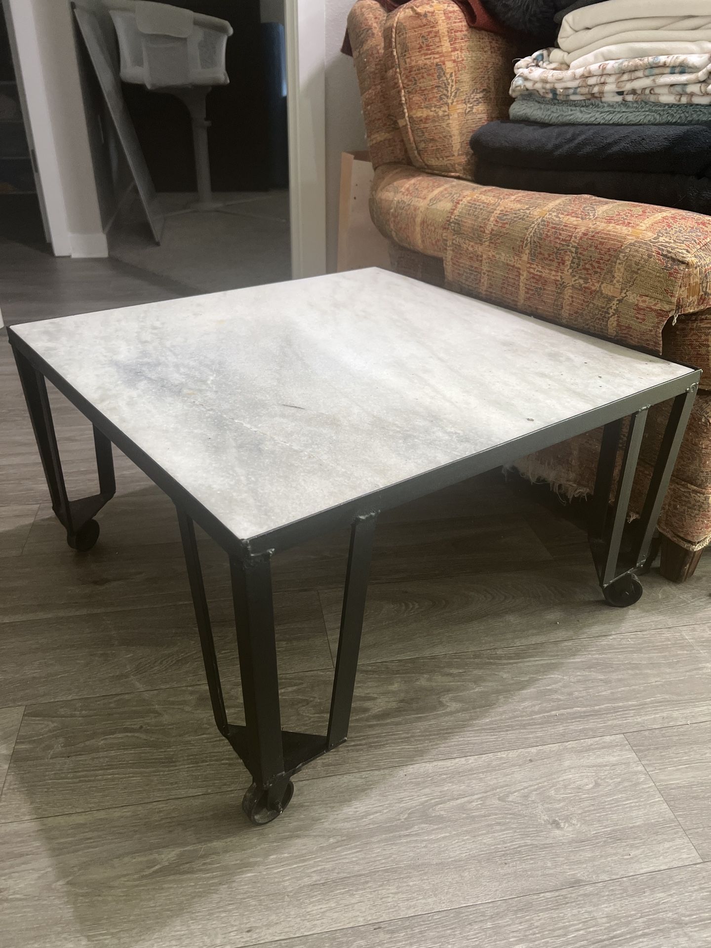 Modern / Rustic Modern Coffee Table Dimensions | 26in x 26in x 15in Top Surface | Marble (White) Legs and Frame | Iron (Black) Wheels | Yes, Iron (Black) *more for ascetic, than functionality $70 or Best Offer Pick Up in Wilsonville, OR