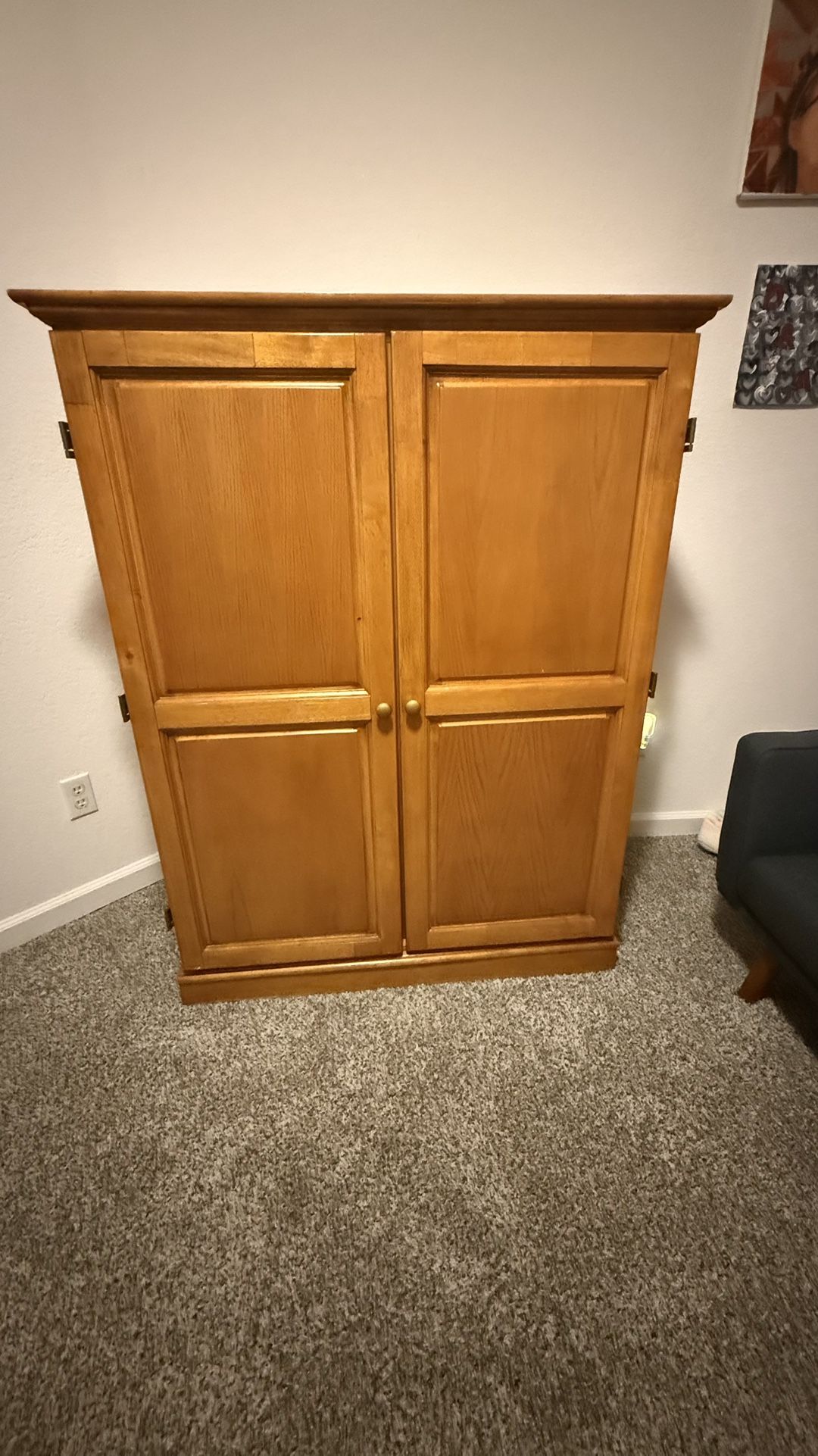 measurements : L: 42 inch W: 23 inch H: 53.5 inch solid wood great storage would work as TV cabinet / bar cabinet / office storage need multiple people to assist moving it out (very heavy)