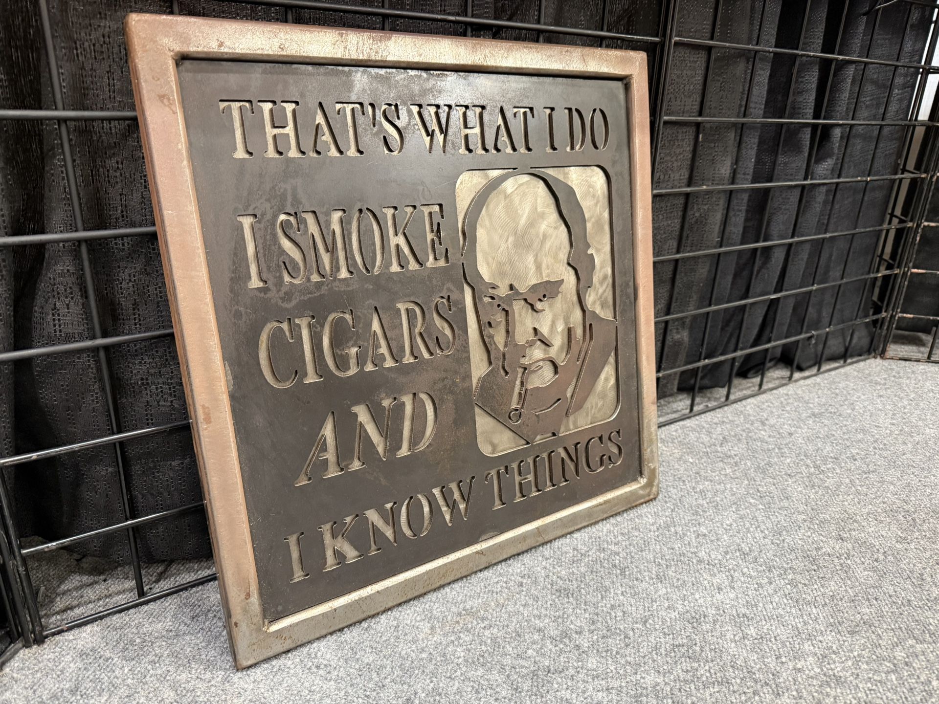 A bold, handcrafted 18”x18” metal wall sign that exudes confidence and charisma. Featuring a laser-cut silhouette of a distinguished cigar smoker and the iconic phrase, “That’s what I do — I smoke cigars and I know things,” this piece is perfect for cigar lounges, man caves, bars, offices, or as a unique gift for any cigar enthusiast. Each sign is made from thick, high-quality metal—not a flimsy sheet—giving it weight, durability, and a premium, rugged look. The brushed and antiqued finish adds character, blending industrial craftsmanship with timeless humor and attitude.