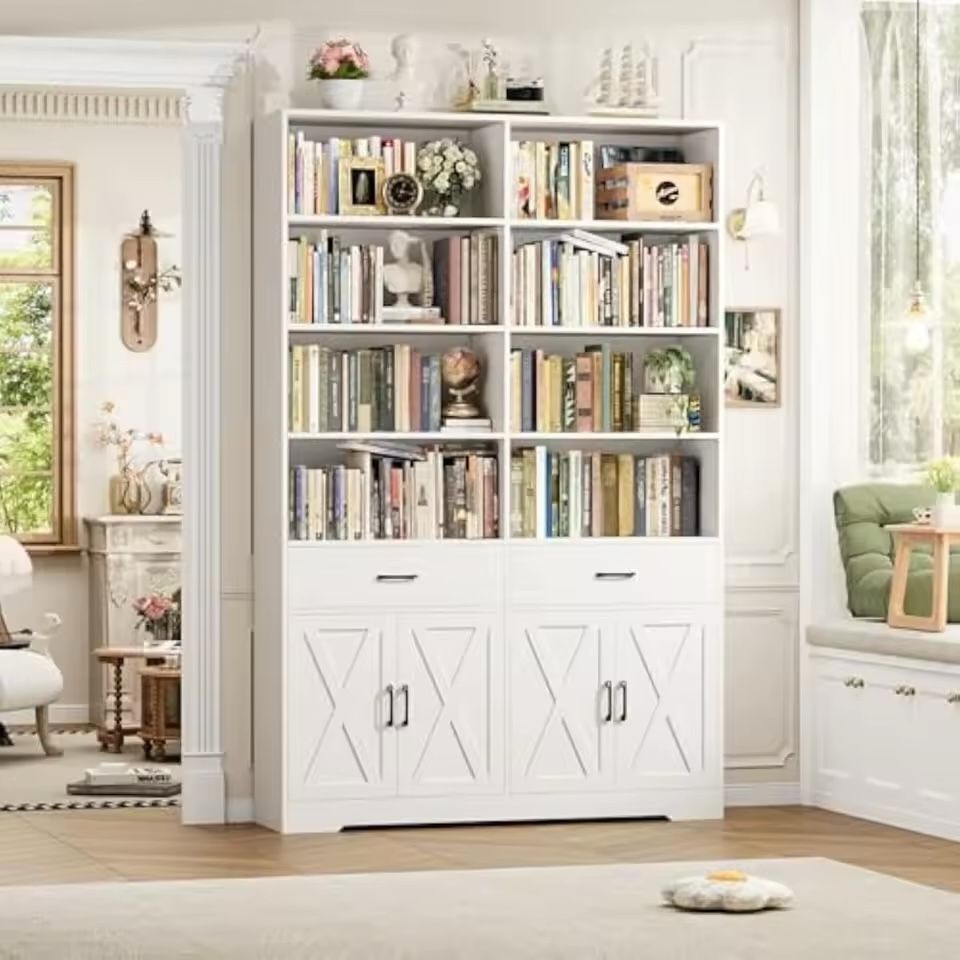 B471 $110 78" Tall Bookshelf with Doors, Double Wide Bookshelf with Storage Drawers, Large Bookcase with Cabinet and 8 Open Display Shelves, Farmhouse Wood Bookcase Book Shelf for Living Room,white Material Engineered Wood Recommended Uses For Product Books, Decorative items Product Dimensions 11.8"D x 47.2"W x 78.7"H Special Feature Door, Drawer Storage Master for Bookworm: Featured 8 spacious open compartments, 2 handy drawers and 2 lower cabinets with fixed shelves, this large bookshelf with small footprint is a perfect pick for your beloveds like books and trophies while keeping your room orderly and tidy Modern Farmhouse Charm: This white bookcase with storage blends rustic charm and refined simplicity, boasting a warm wood finish, signature X-barn doors, and sleek black handles. Its timeless design balances cozy character and clean lines for home aesthetics Versatile Uses: Except organizing folders neatly in your office, this wide bookcase also works well as a distinctive display shelf to showcase family photos/collectibles, or create a cozy library-style reading nook when paired. Moreover, it even works great as a pantry for kitchen overflows Built to Last: Made from high-quality engineered wood and completed with a floor-standing base, this wooden bookshelf delivers excellent stability and long-term durability. Every door features soft-close hinges for silent use. Overall size:47.2"W x 11.8"D x 78.7"H Effortless Assembly: This freestanding book shelves is easy to assemble with the labeled parts and detailed instructions. Please ensure all the parts are present and intact before setup and we kindly suggest that two adults work together for it His-pb-392