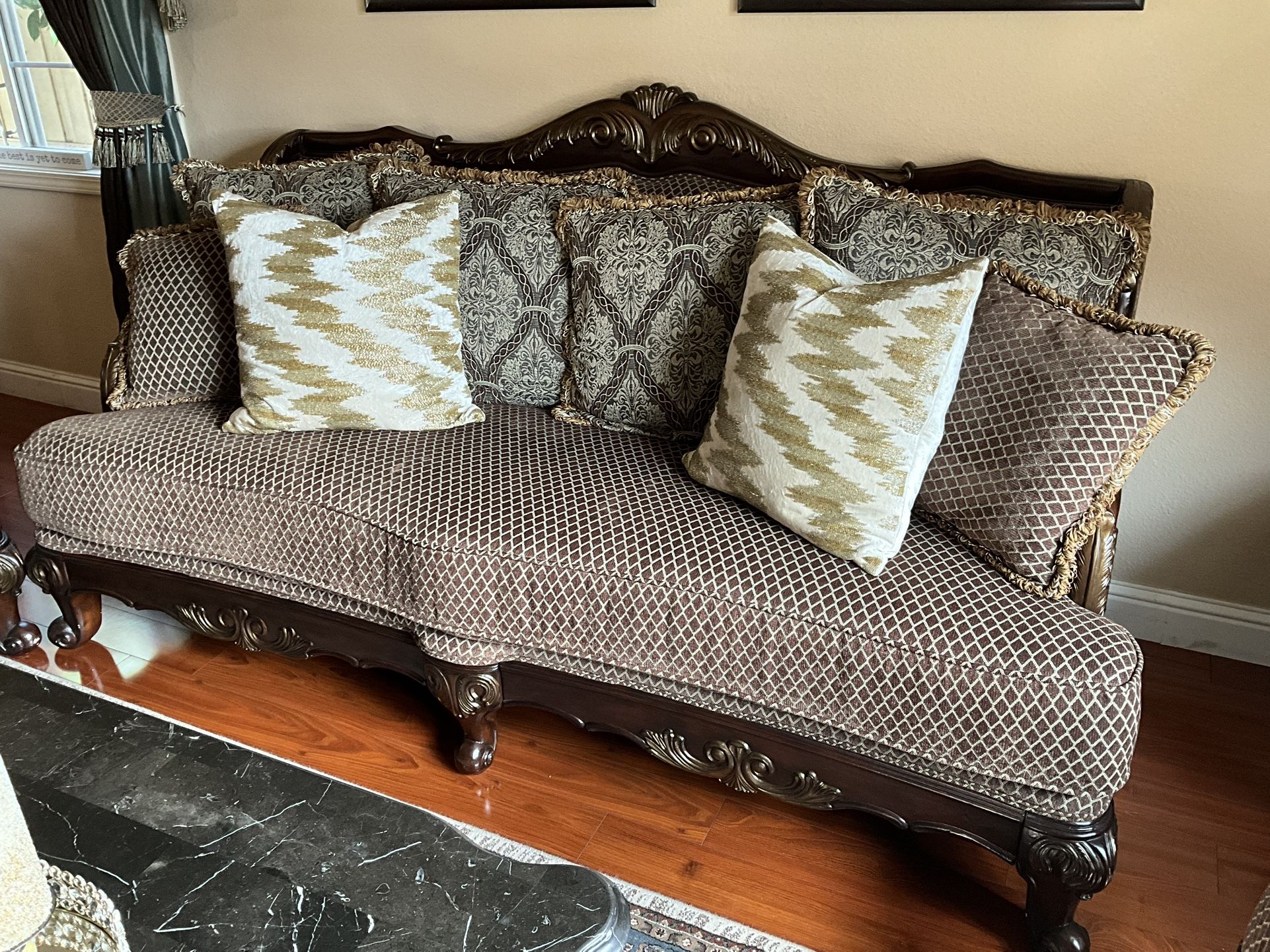Traditional Style 3 Peace Sofa Set, include sofa, loveseat, and a large chair, brown color with accent pillows