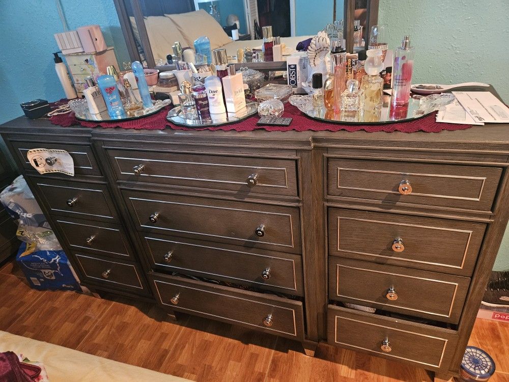 Almost brand new dresser, stone grey. Lots of drawers and mirror in excellent condition. Mirrors ON dresser not available.