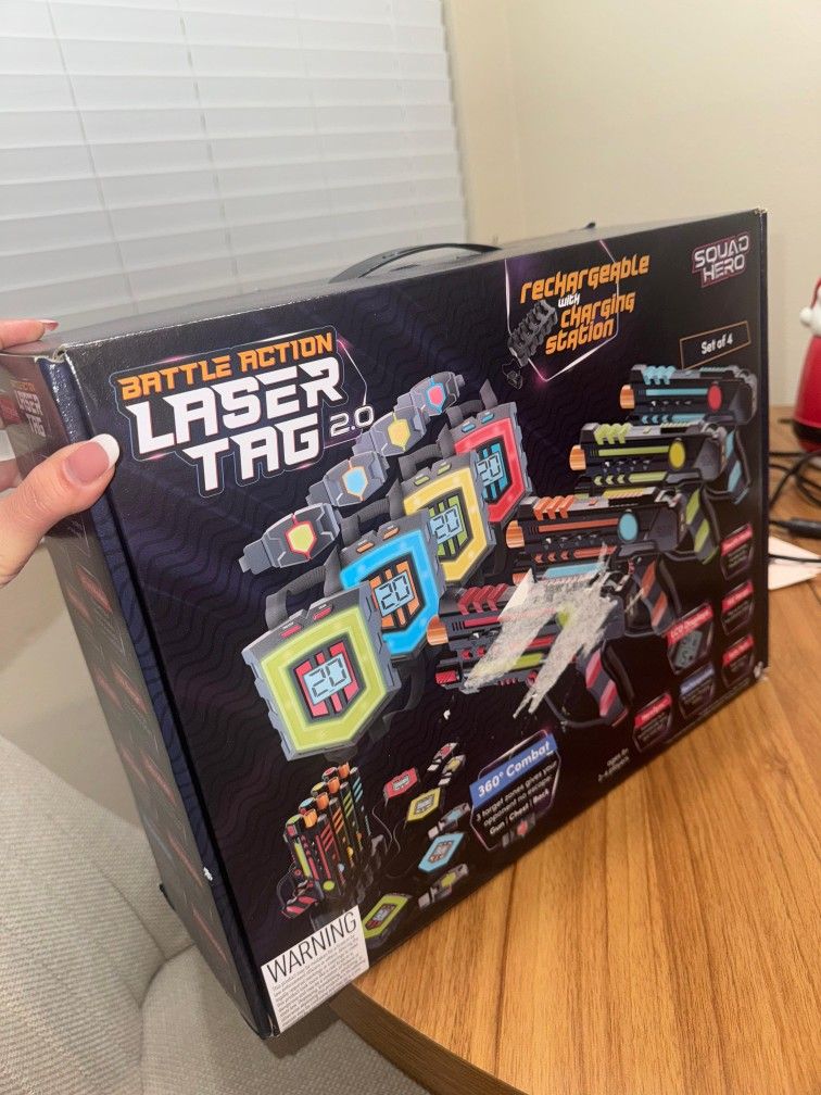 Rechargeable Laser Tag Game + Innovative LCD and Sync – 4 Pack of Infrared Guns and Vests – Group Toys and Games for Kids, Teens, and Girls – The most innovative laser tag battle set yet: Get ready for a fight for domination! Buckle up your vest, grab a gun, check your ammo, and transform your backyard or basement into a battle zone for an ultra-tech laser tag war. Run, hide, circle, aim, and eliminate your enemies to win the game! Includes: 4 guns, 4 vests (front and back), and a charging station. Rechargeable Equipment: You'll never have to stop the game to change batteries. The guns and vests are fully rechargeable! The set includes an innovative charging station to easily charge all the equipment at once. You can play approximately 8 games per charge. Juego de etiquetas láser recargables + innovadoras LCD y sincronización – Pack de 4 pistolas de infrarrojos y chalecos – Juguetes de grupo y juegos para niños, adolescentes, adolescentes y niñas – El set de combate láser más innovador hasta ahora: ¡Prepárate para una lucha por la dominación! Abrocha tu chaleco, toma una pistola, verifica tu munición y transforma tu patio trasero o sótano en una zona de batalla para una guerra de etiquetas láser ultra-tecnológica. ¡Corre, escóndete, rodéate, apuntá y elimina a tus enemigos para ganar el juego! Incluye: 4 pistolas, 4 chalecos (delantero y trasero) y una estación de carga. Equipo recargable: Nunca tendrás que detener la acción del juego para cambiar algunas baterías. ¡Las pistolas y chalecos son completamente recargables! El set incluye una innovadora estación de carga para cargar todo el equipo a la vez fácilmente. Puedes jugar aproximadamente 8 juegos por carga.