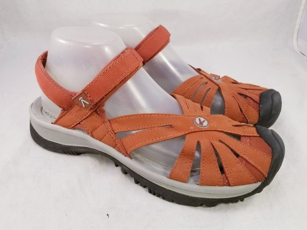KEEN ROSE WOMEN SHOES SANDALS RED SIZE 39.5/9 EUC * USED WITH LIGHT SIGN OF WEAR- LIGHT SOIL ON OUTSOLES ONLY * UNKNOW RELEASED AND MANUFACTURED YEAR. * Size marked US 9/ EUR 39.5 * Color is BRICK RED * STYLE IS ROSE * Outside length is 10 1/2 in. * Width is 4in. * Heel height is 1 in. * Inside length is 10 in. * Item will be nicely packed and shipped the same or next business day of cleared payment. * No shoe tree included- NO BOX OR TAGS * WE DO NOT USE STOCK PHOTOS. ACTUAL ITEM IS SHOWN 3839-C2 Sahara and sloan lane