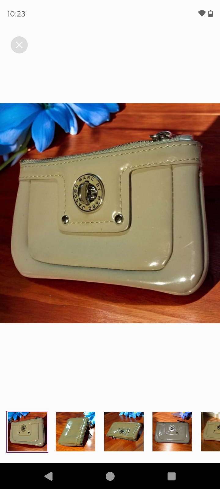 Marc by Marc Jacobs zippered coin purse or card wallet, identified by the signature round metal logo on the front. It's a beige or taupe shade in a patent-finish leather with a bLue & white polka dot interior. Single Compartment, Silver toned zip closure, Enameled Turn Lock Accent "Marc Jacobs" 100% Cow Leather Approx measurements : 5" Depth 5 3/8" Height 5 3/4" Width Excellent Pre Owned Condition See Photos for Exact Condition
