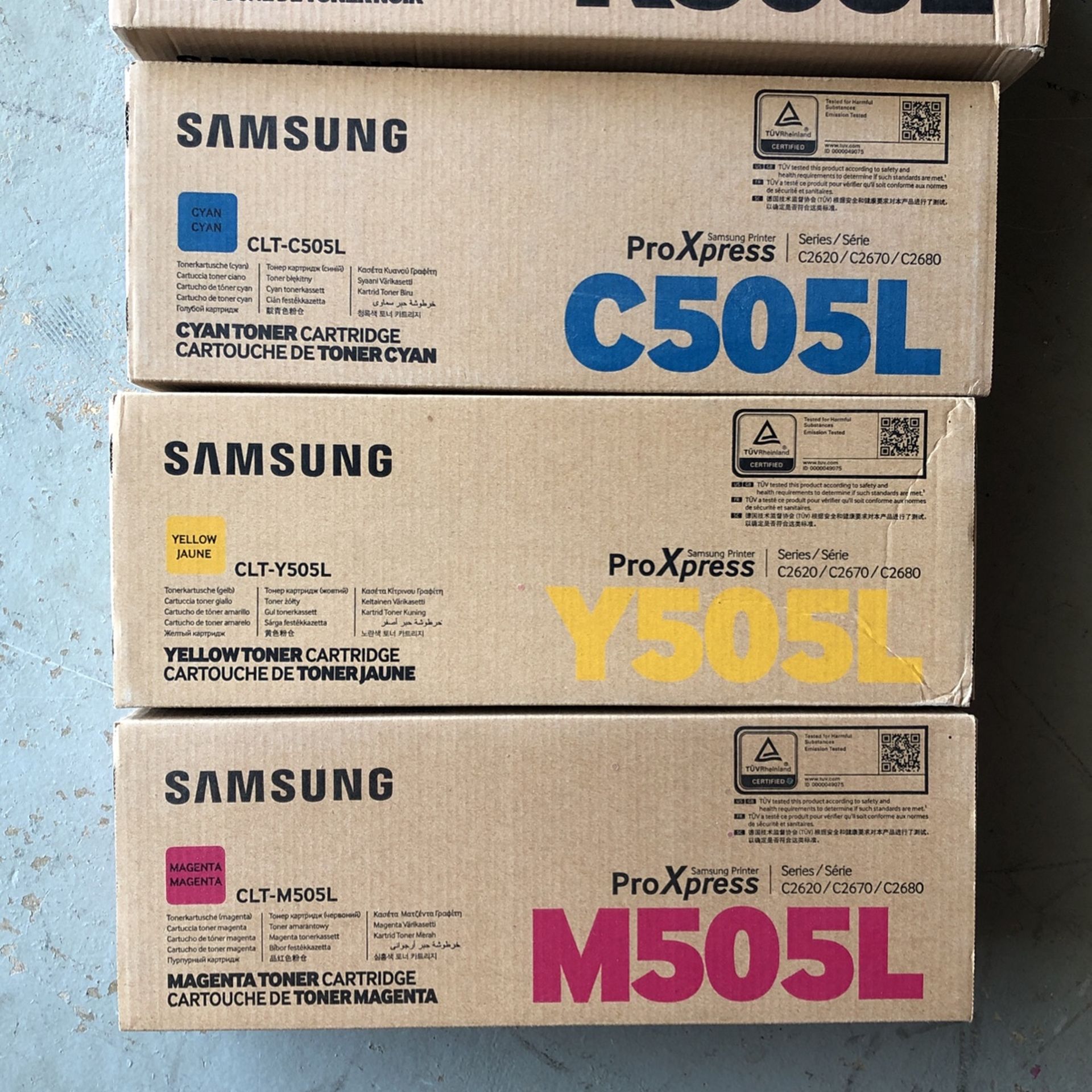 Genuine Samsung cartridges. Magenta, yellow, cyan, and black. For C2620/C2670/C2680 laser printer.