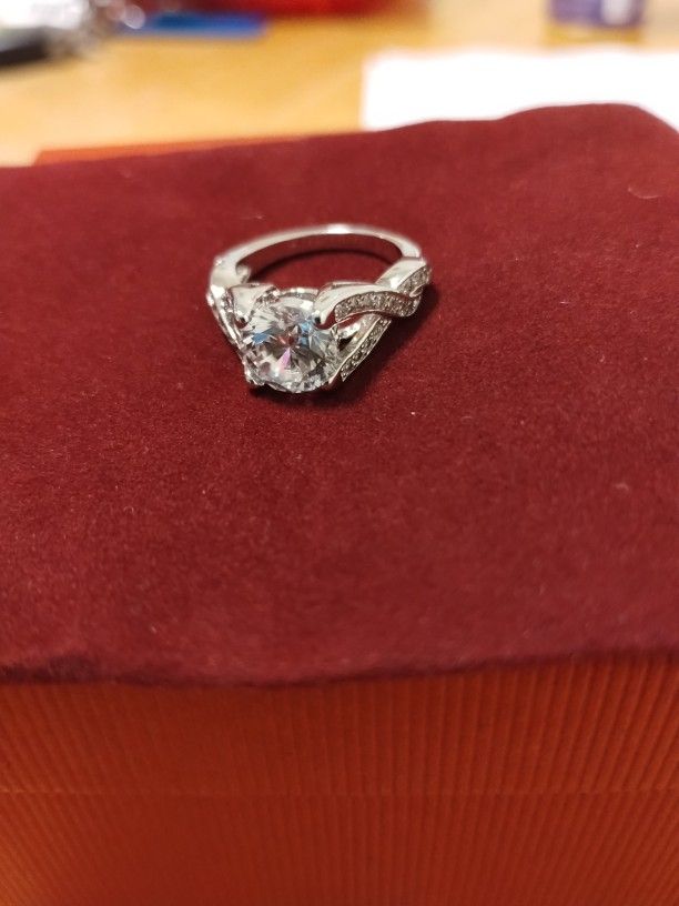 Size: 5. This twisted ring features a band width of 2. 5 mm and a carat weight of 4. 50 ct. It is made of a lead-free alloy (brass) and plated with rhodium. The ring is adorned with white sapphire stones, which are set in a pave setting. With a size of 22 mm l x 8 mm w x 8 mm h, round-cut stones measure 1. 6 mm in size. Believed to be simulated gemstones