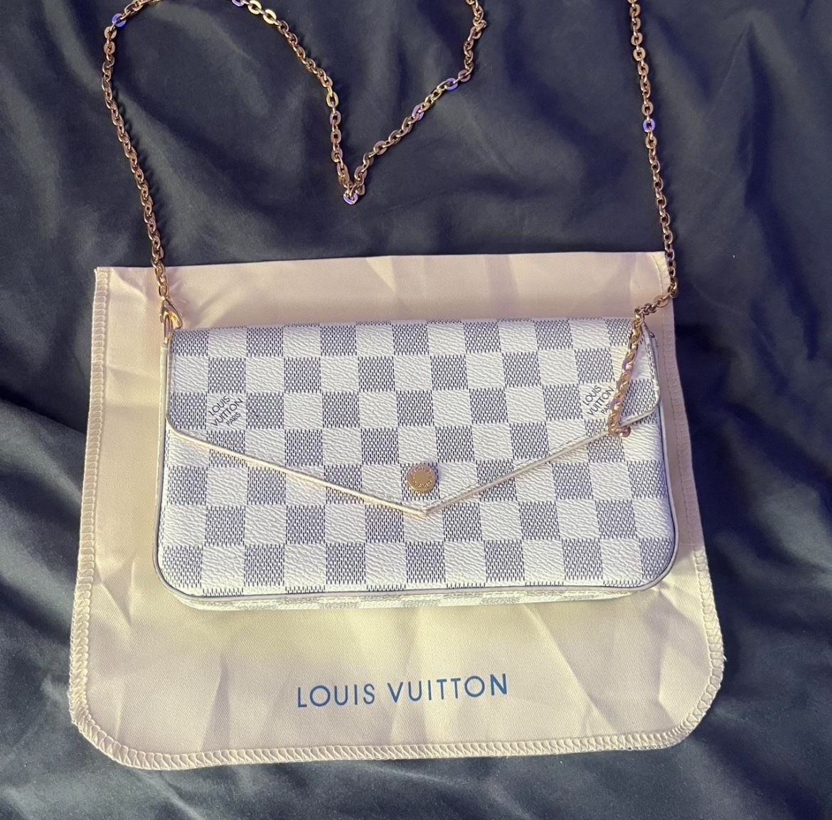 The Louis Vuitton Damier Azur Canvas Crossbody Clutch Bag Purse is a stylish and versatile handbag designed by Louis Vuitton. Made with black coated canvas exterior and a red canvas lining, this small rectangular bag features a snap closure and gold-plated hardware accents. The bag comes with a detachable crossbody strap, making it perfect for various occasions including parties, casual outings, or formal events. With its iconic Louis Vuitton Damier Azur pattern and designer theme, this LV handbag is a must-have accessory for any fashion-conscious woman.