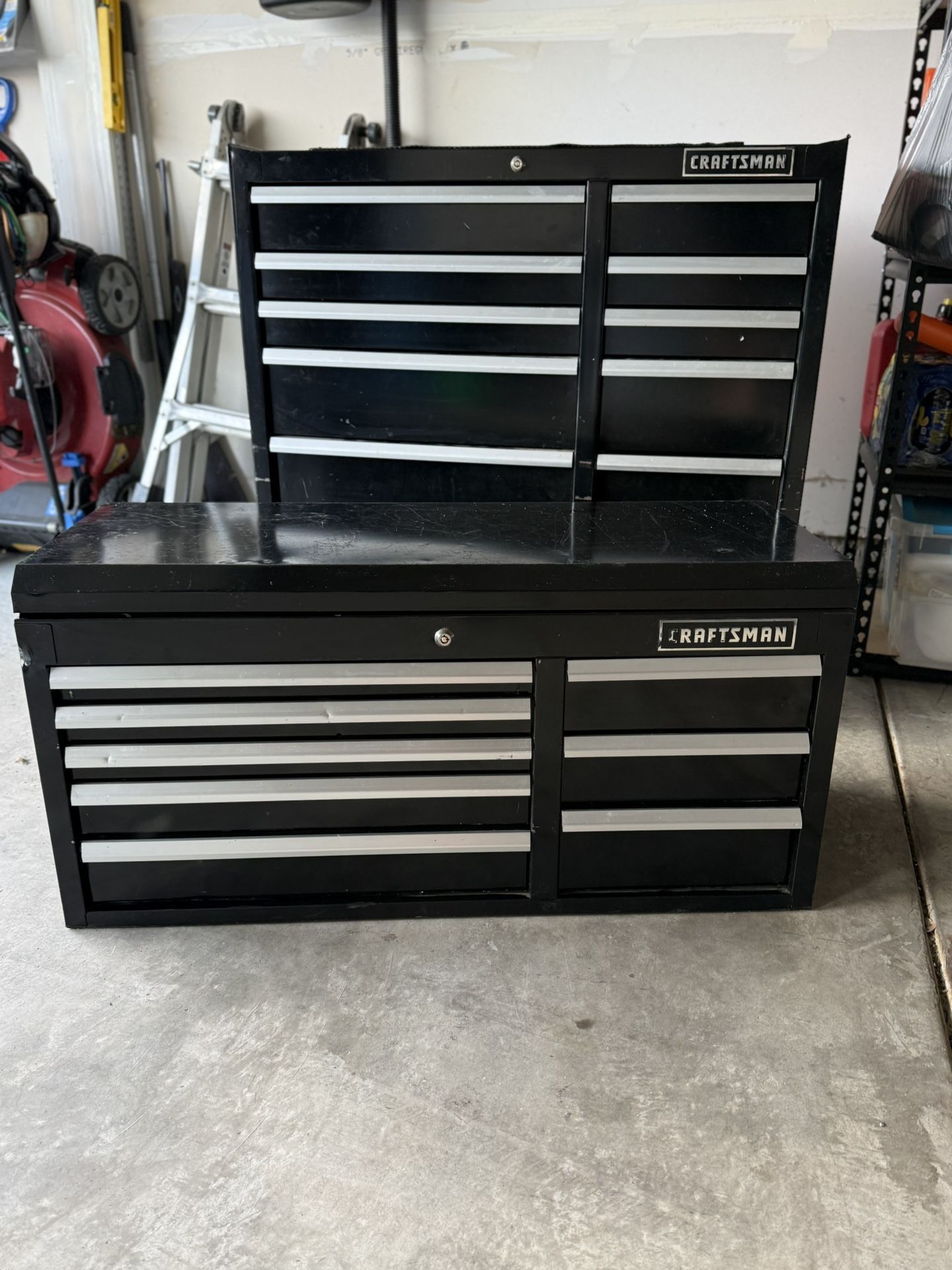 Rolling tool cabinet with ample storage space 2 separate pieces stacked Bottom piece has 11 drawers Top piece has 8 drawers with top storage and locking lid 41 in wide 60 in high