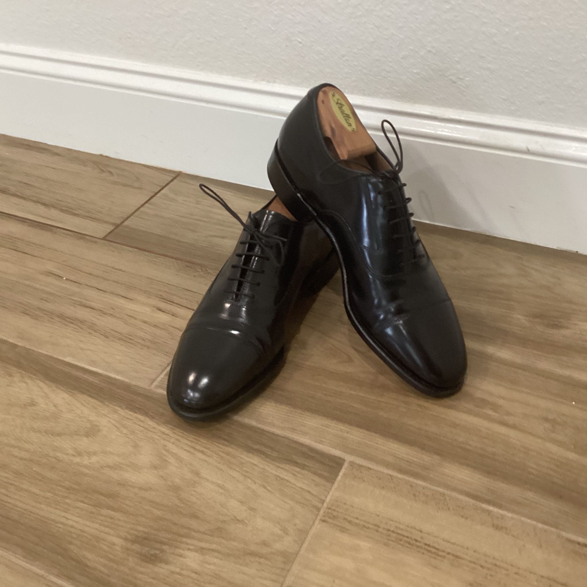 This product is a stylish pair of men's dress shoes by Johnston & Murphy in size 8.5. The black exterior with brown interior gives it a classic and sophisticated look, perfect for formal occasions. Made of leather with a round toe shape and solid pattern, these Oxford style shoes feature a comfortable leather lining and insole. Ideal for summer, fall, and spring seasons, these shoes are a versatile addition to any man's wardrobe. Made in India, these shoes offer quality craftsmanship and timeless style for the modern gentleman.