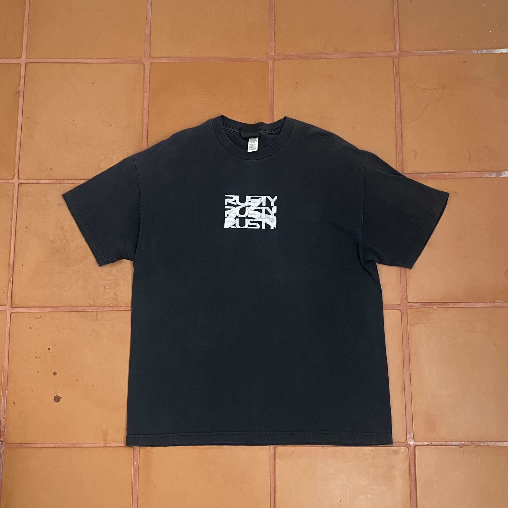 2000’s Rusty Surfboards Black T Shirt Size XL Vintage Double Sided Print has some fading to it