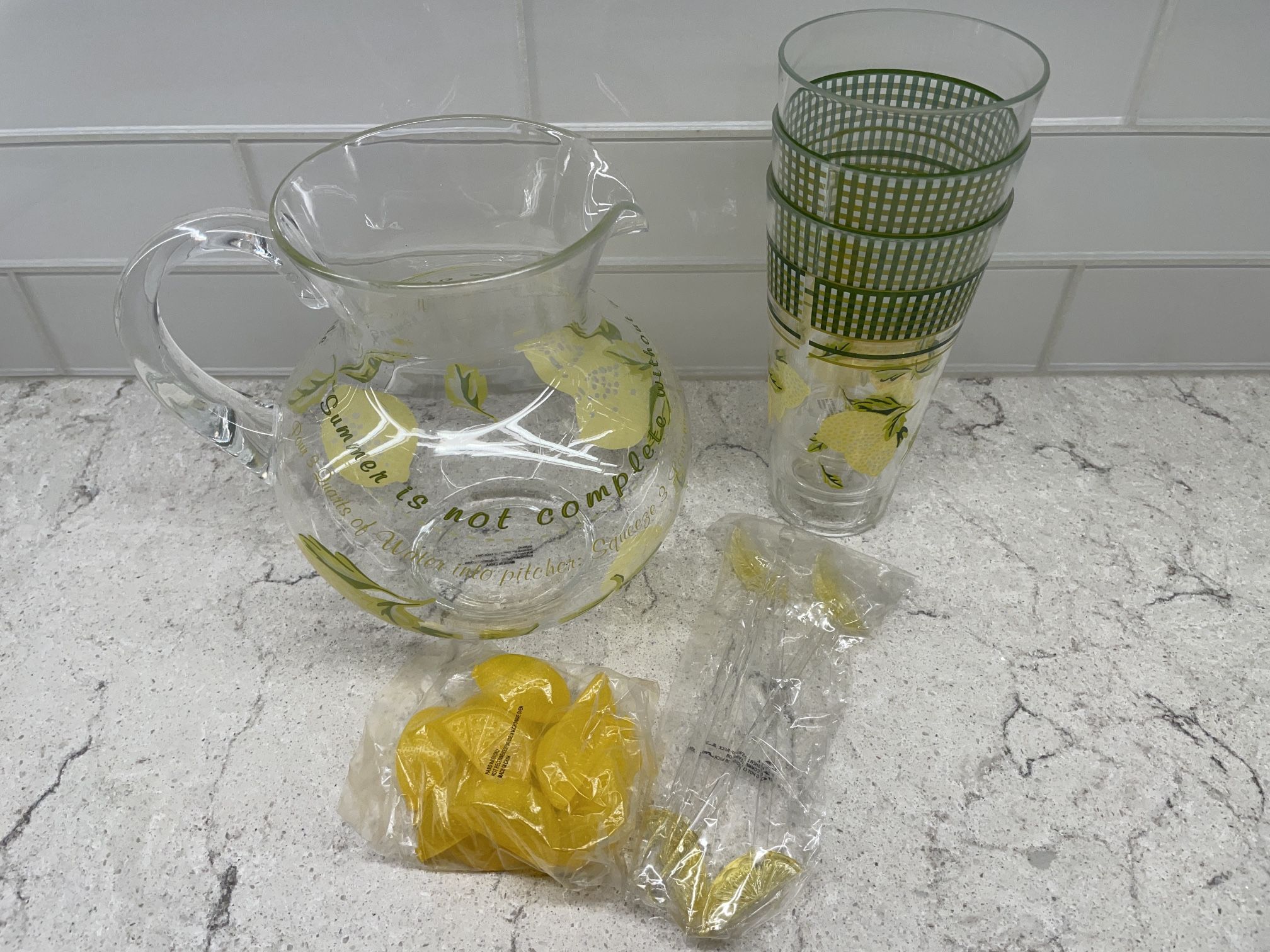 Great for summer entertaining. Plastic pitcher and cups. Includes stir sticks and lemon shaped freezable ice cubs.