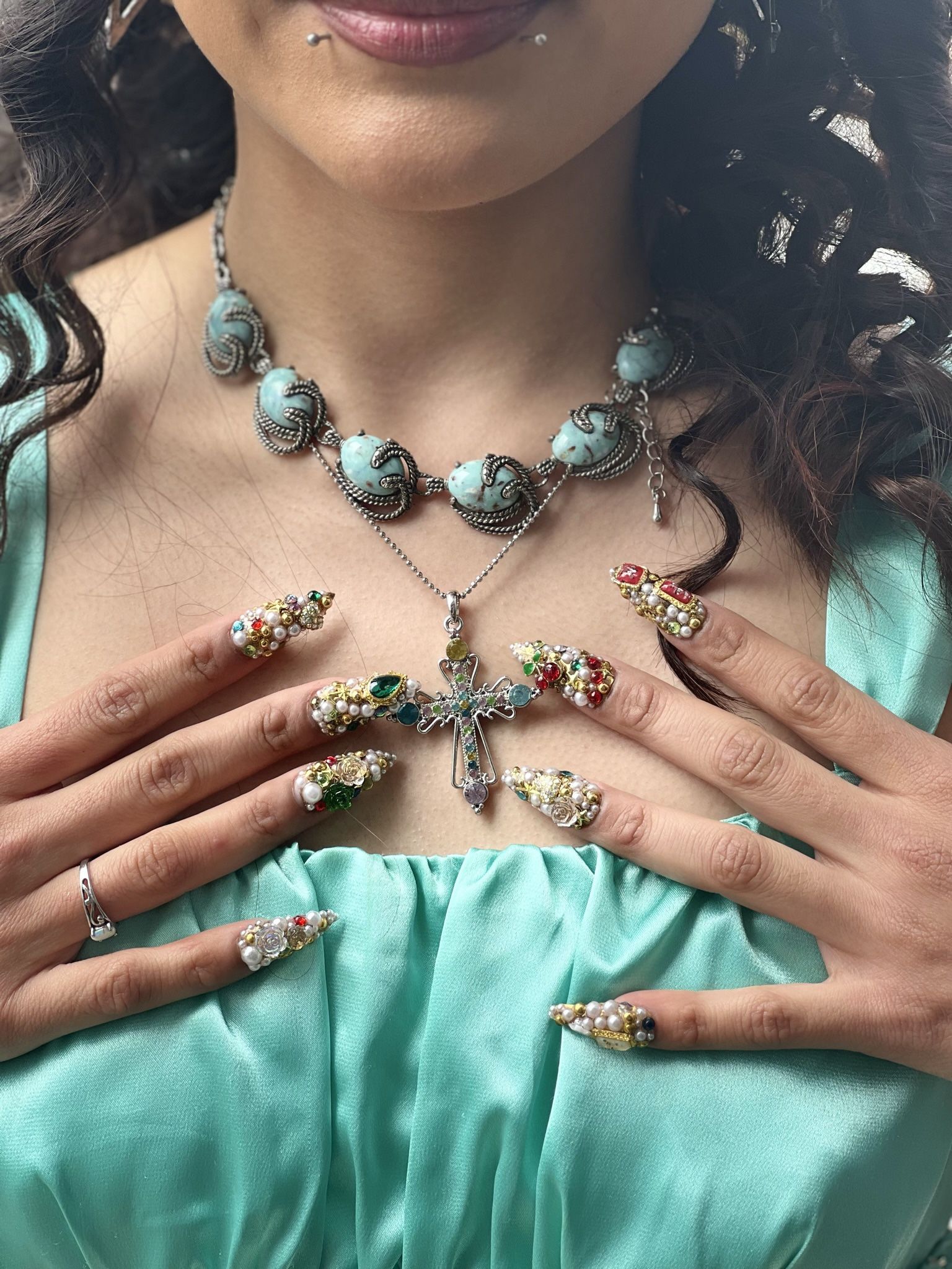 Vintage Southwest Blue Lucite Confetti Cabachon Silver Tone Necklace