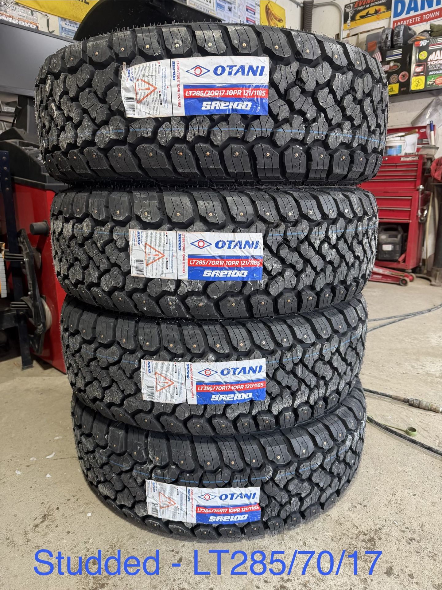 (4) - LT285/70/17 Otani SA2100 Studded Tires 50,000 mile rated tires Cards accepted with 2.8% merchant fee Installation is $31.25 per tire plus tax. $5.00 per tire to recycle the old tires Condition - Brand new, never mounted. Load range E - 10 ply tires Lifetime flat repairs included WITH the purchase of mounting and balancing. Does not apply for cash and carry sales. Price is FIRM, NOT accepting offers. Not interested in trades. Cash only. Other sizes and brands available, let me know if you’d like a quote. Thanks for looking!