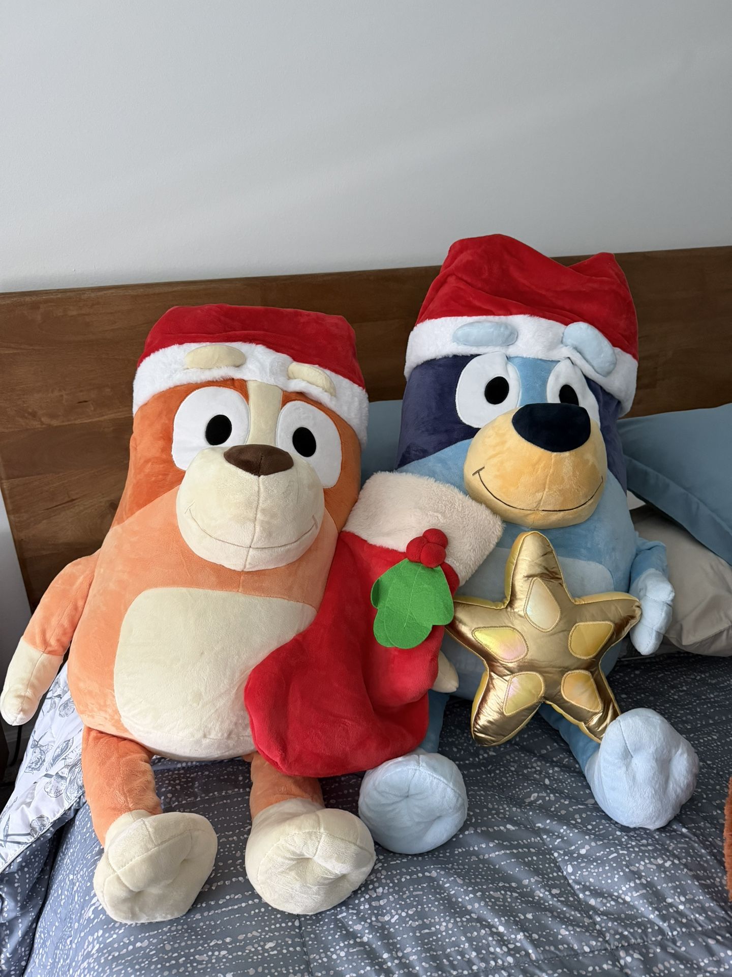 Selling 2 giant plush toys inspired by Bluey & Bingo (Christmas edition with Santa hats + accessories). They are super soft, clean, and in great condition. ✅ Big size (perfect for kids / room decor) ✅ Comes as a set: Bluey + Bingo ✅ Cute holiday theme (Santa hats + stocking/star) ✅ Great gift idea
