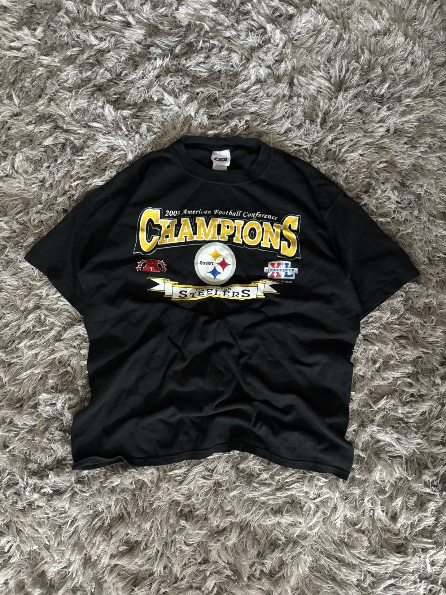 Black 2005 NFL AFC Champions Pittsburgh Steelers T-shirt with bold front graphic. Tagged XL but definitely fits like a Large. • Pit to pit ~23” • Length ~26” • Size: XL (fits like Large) Great condition. Favorite piece.
