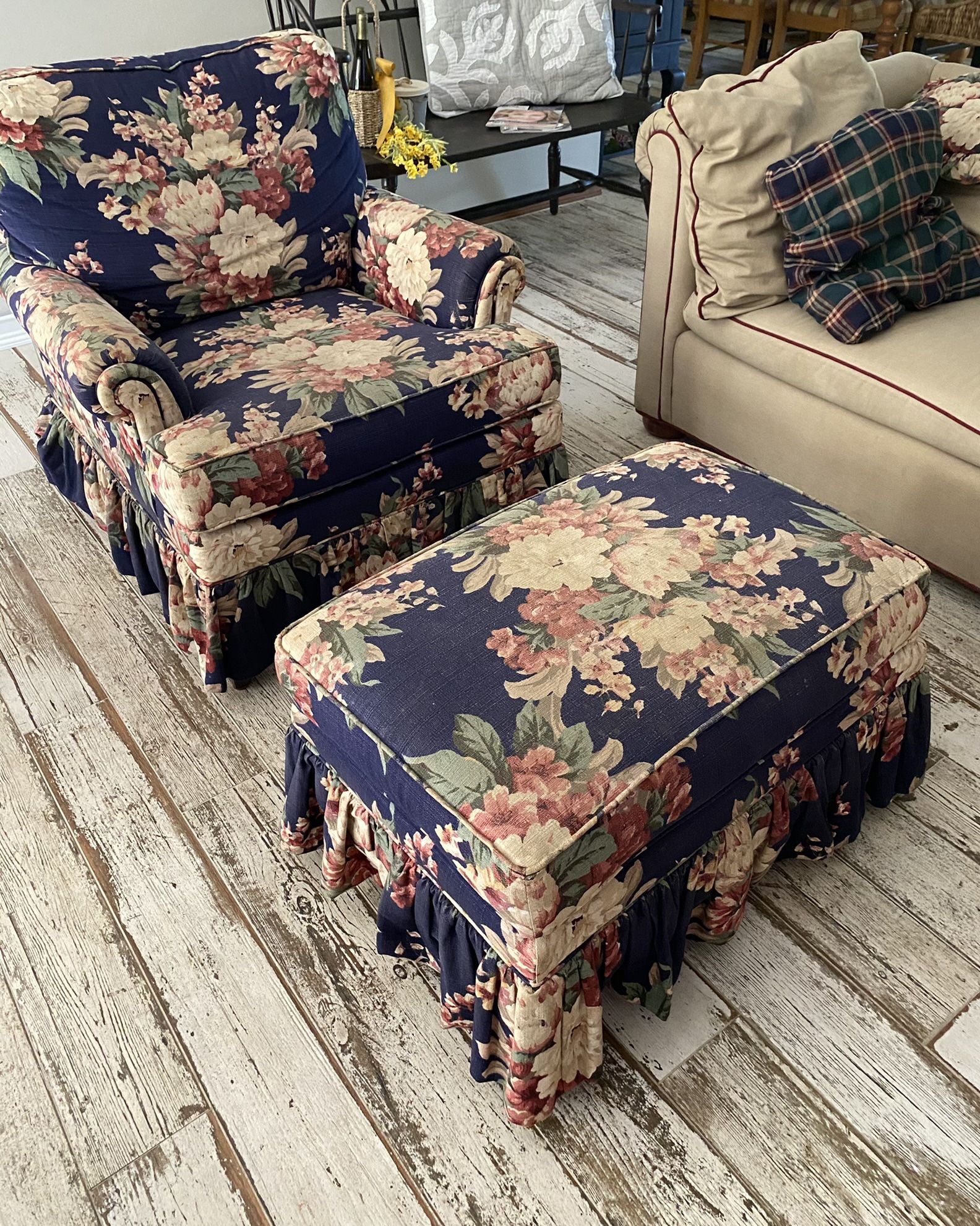 Looking for a great quality extremely comfortable Ethan Allan Chair and Ottoman cheap? Great candidate for reupholster project or chair covers. 33.5D x 33H x 35W