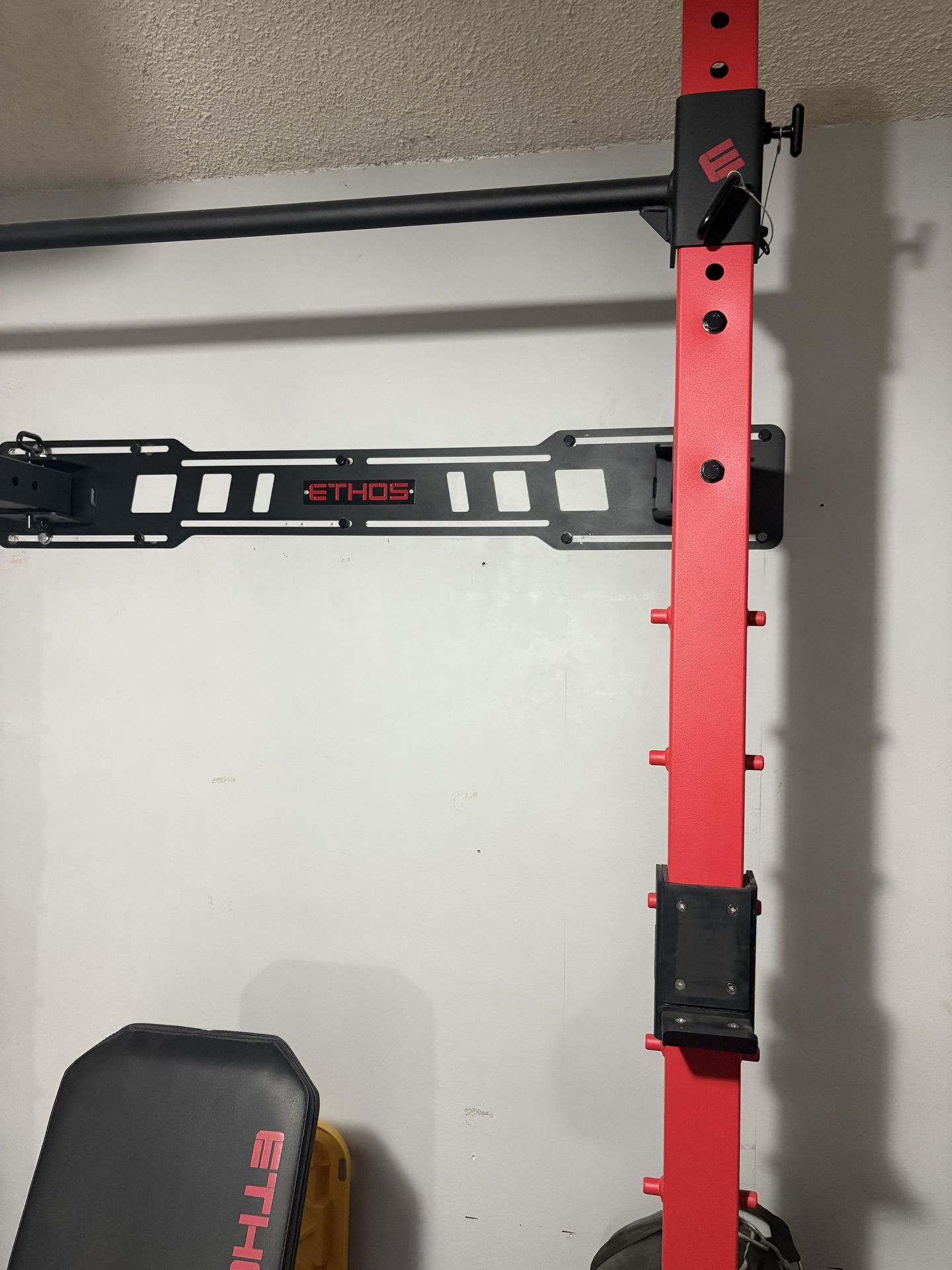 NEVER USED Screws into wall and folds up Comes with safety rack And pull-up bar attached Never used literally