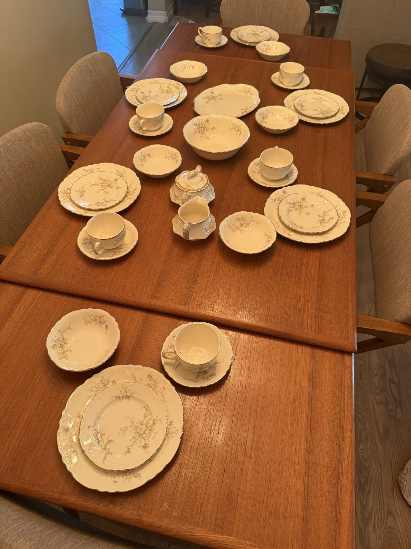 This Homer Laughlin vintage China in Virginia Rose pattern is intact as a set of 6 luncheon plates, dessert plates, salad bowls, teacups and saucers. Also is a creamer and sugar dish, a meat plate and a vegetable bowl. The meat plate has a small blemish. I will sell pieces individually as well.