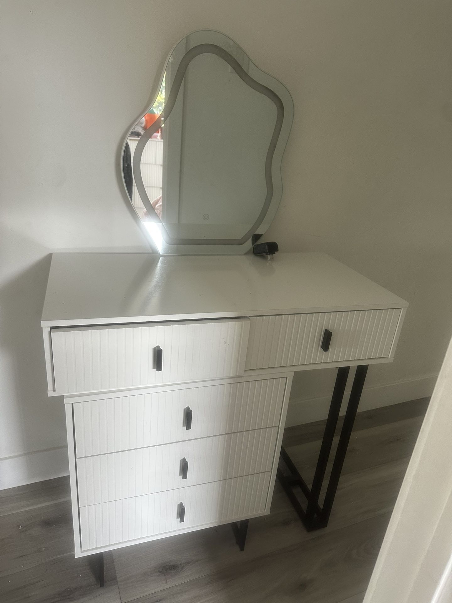 Really good condition! The mirror has lights that have cool and warm settings and the ability to dim