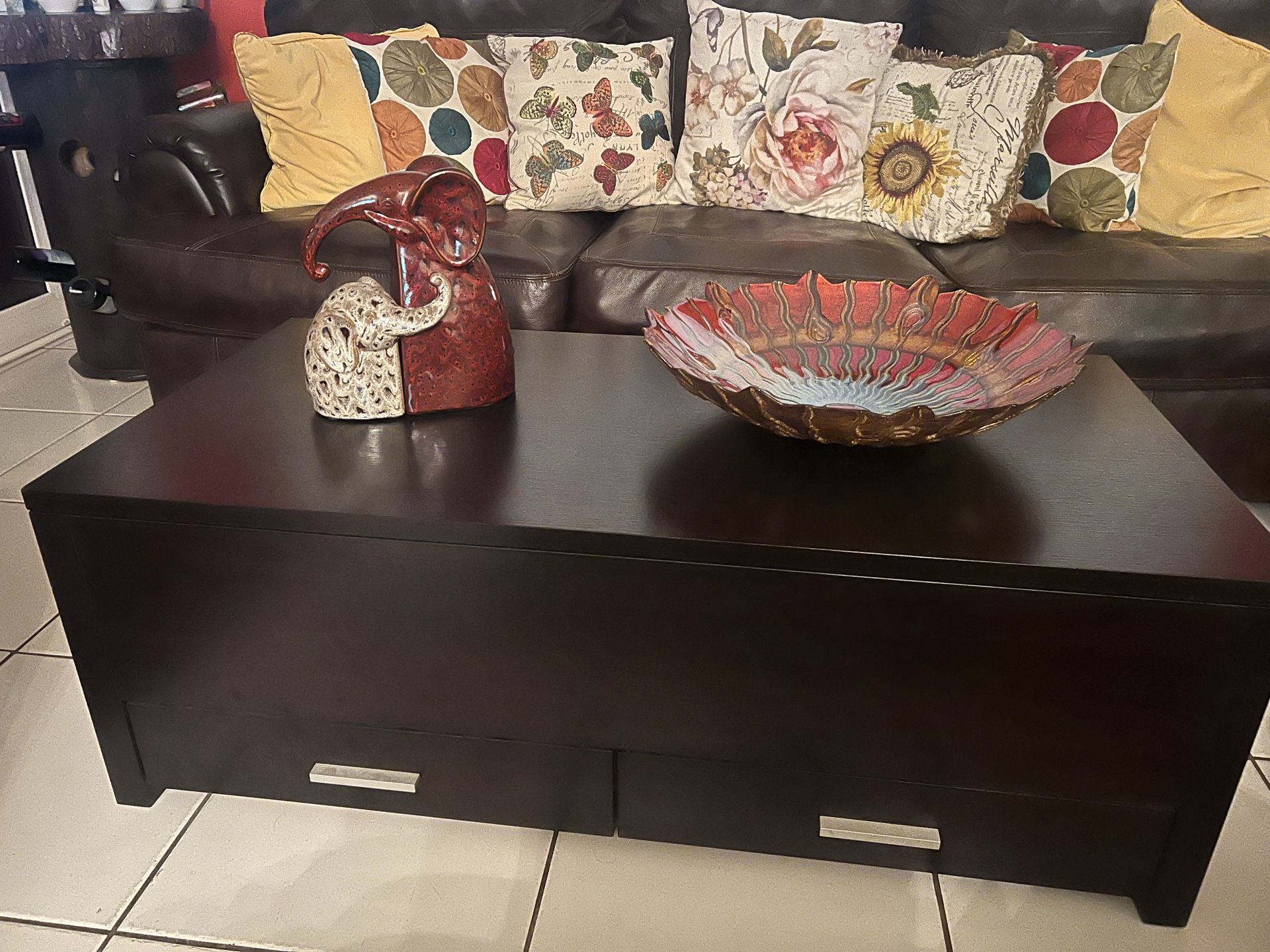 Stylish dark brown coffee table featuring a slide-open expandable top for extra space. Includes two drawers for convenient storage—perfect for keeping your living room neat and organized. Functional, modern, and a great value at just $100!