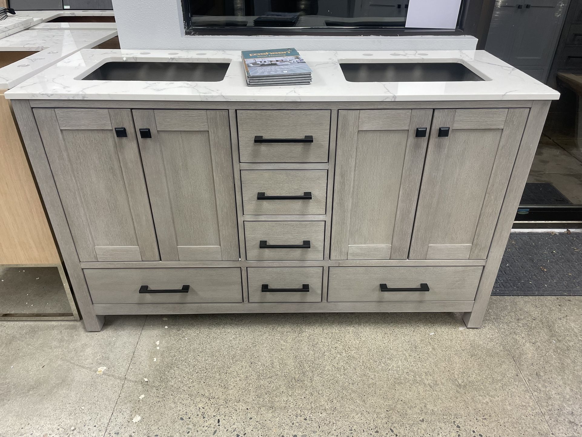 Bathroom vanity cabinet 60” solid mango Quartz top with sinks and backsplash
