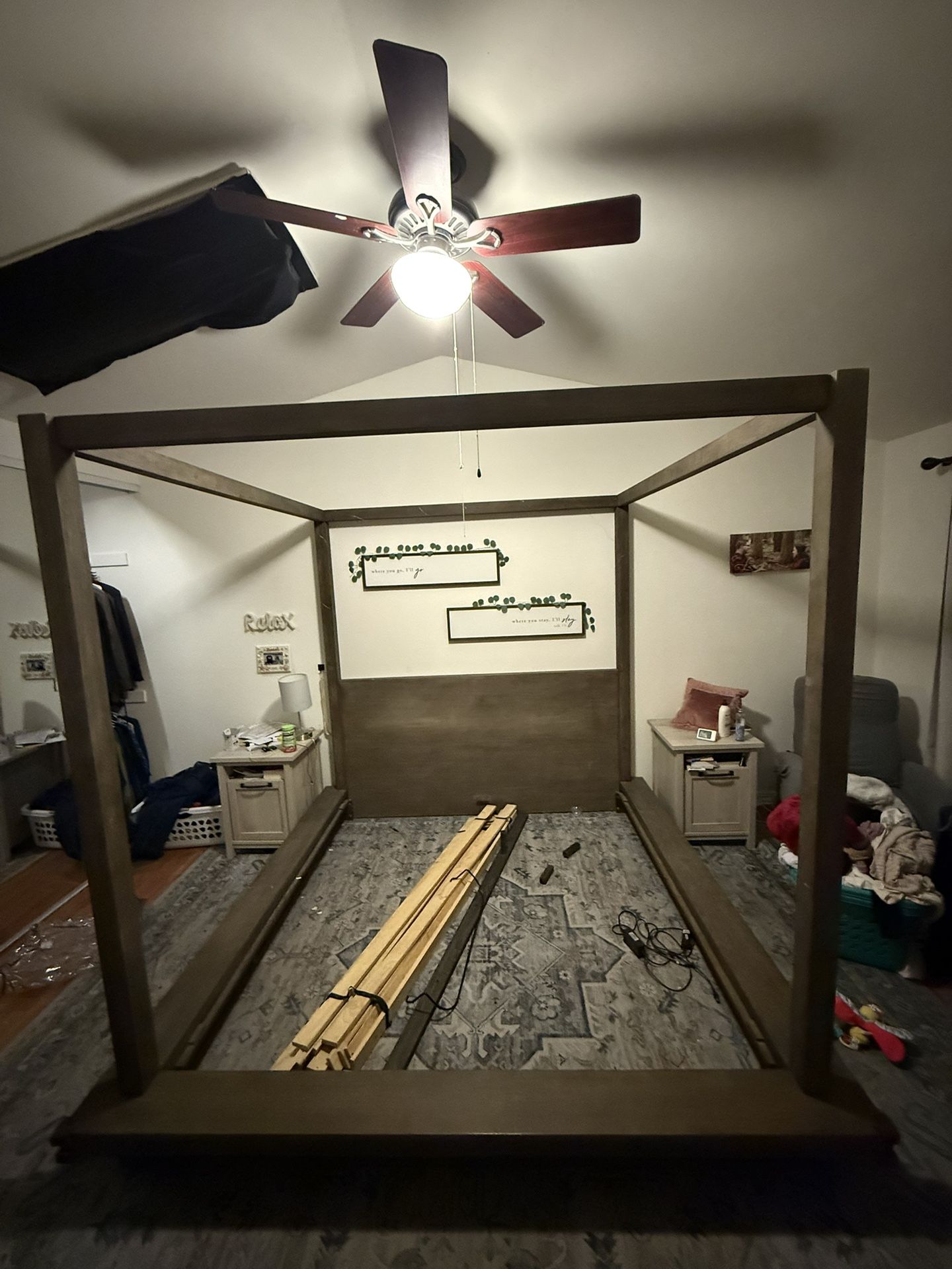 Hi, this is a four poster king bed frame. Has a few blemishes but is overall in great condition. Please see the final picture for dimensions and how the mattress sits in the frame. My wife and I had an adjustable base in the frame so it was a tad higher up (this base is not included but it comes with the slats for the mattress to sit as in the picture). Please let me know if you have any questions. Thanks for looking!