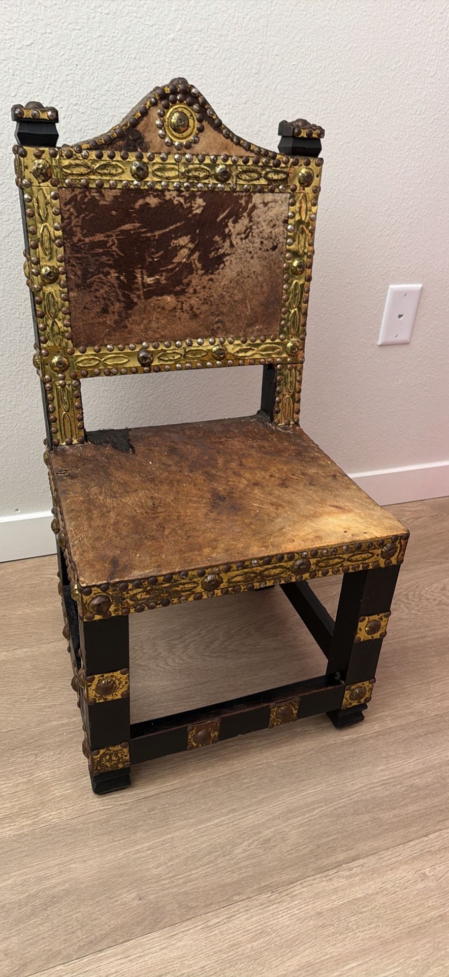 Solid wood frame Decorative metal/brass-style trim and studs Vintage, distressed leather/velvet panels Sturdy structure Seat shows wear (see photos) - ideal for reupholstery or restoration