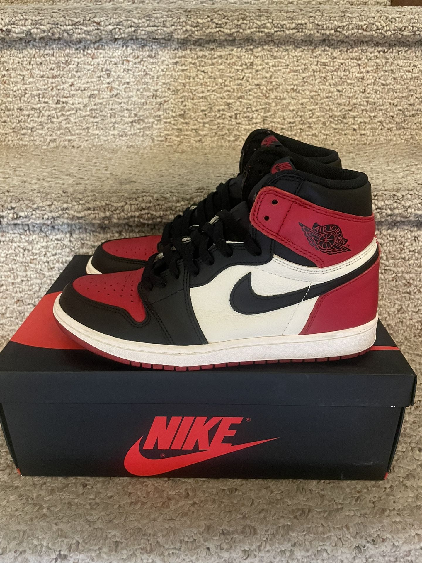 Size 7.5 air Jordan 1 bred toe Used 9/10 condition. OG box Trades in size 7-7.5