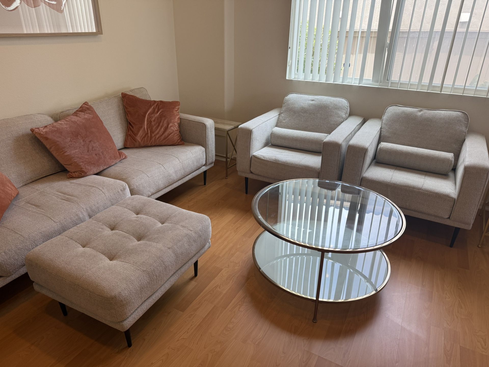 Sofa two chairs, three tables and an ottoman for sale. Everything for $250 OBO, willing to sell separately as well . Two years old, moving to Arizona, so must sell. Thanks for looking !