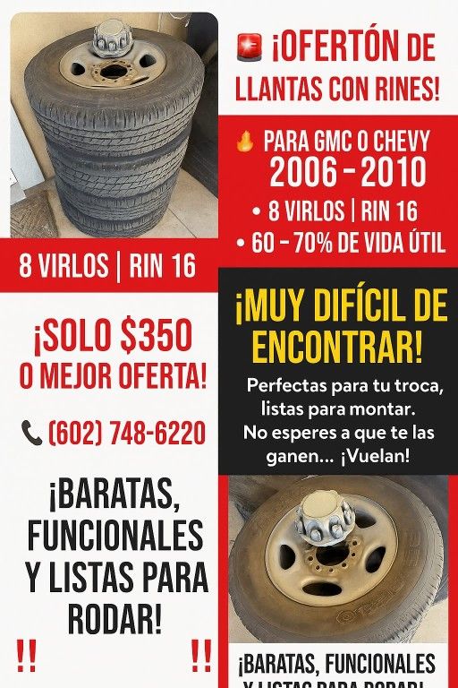 ✅️🔥👉🏻 VENDO LLANTAS BARATAS 🚨 ¡OFERTÓN DE LLANTAS CON RINES! 🚨 🔥 Para GMC o Chevy 2006–2010 🔥 🛞 8 virlos | Rin 16 🧩 60–70% de vida útil‼️ ■●▪︎▪︎▪︎▪︎▪︎▪︎▪︎▪︎▪︎▪︎▪︎▪︎▪︎▪︎▪︎▪︎▪︎▪︎▪︎▪︎▪︎▪︎▪︎ 💯💸 ¡A tan Solo $350 o mejor oferta! ▪︎▪︎▪︎▪︎▪︎▪︎▪︎▪︎▪︎▪︎▪︎▪︎▪︎▪︎▪︎▪︎▪︎▪︎▪︎▪︎▪︎▪︎▪︎▪︎●■ 📢 ¡MUY DIFÍCIL DE ENCONTRAR! Perfectas para tu troca, listas para montar. 🔥 No esperes a que te las ganen… ¡Vuelan! 🔥 📲 Contáctame YA: ☎️ (602) 748 ▪︎ 6220 ‼️ ¡Baratas, funcionales y listas para rodar! ‼️ .