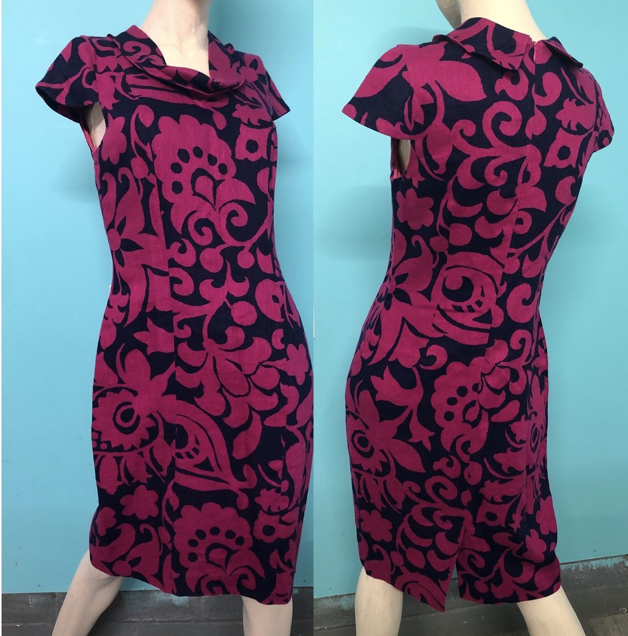 Bold floral, Cowl neck, wiggle, pencil dress. Beautiful dress made from a very large bi-color, scrolling, floral print fabric and has a drooping sort of modest neckline, and short cap sleeves. It has a fitted design, with a pencil skirt, and short back split and it’s fully lined. Brand: Talbots Era: 2000s to contemporary. Original tag price: approximately $140 Color: fuchsia/hot pink and deep navy blue Size: 6 Fiber content: 100% linen shell, 100% polyester lining. Condition: new without tags/flawless. Measurements: side to side and top to bottom armpit to armpit: 18 inches Across waist: 15 1/2 inches Across hips: 20 inches Across hem bottom: 24” Across shoulders in back: 14 1/4 inches Sleeve length: 4 1/2 inches Split length: 7 1/4 inches Length from top of shoulder to hem: 39 inches