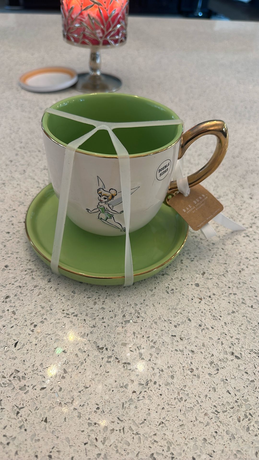 Rae Dunn Tinkerbell Plate and Saucer Set with Golden Trim and Handle, Disney Collectible Tea Set, Elegant Ceramic Cup and Plate Gift , Reg 50.00